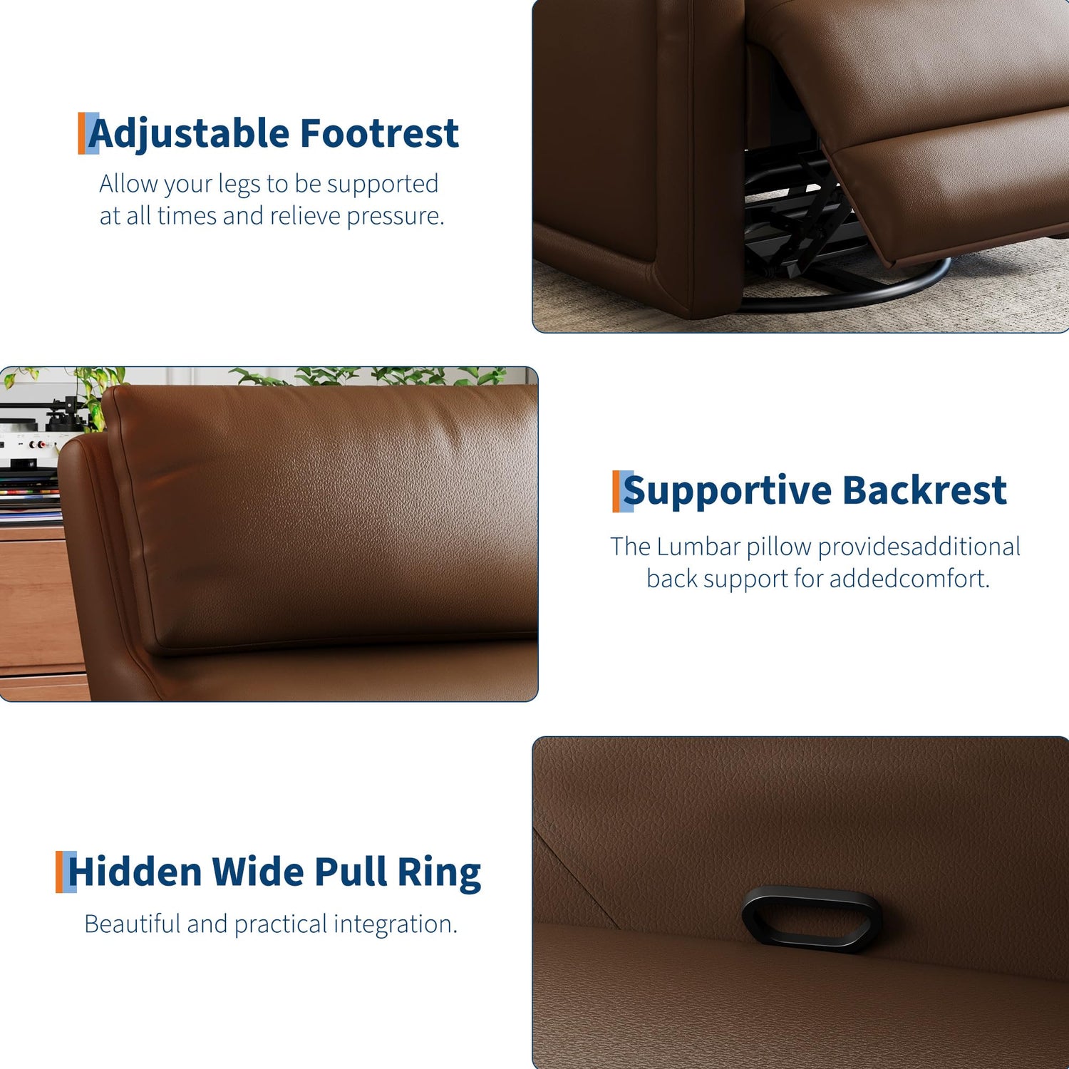 - 【Adjustable Backrest and Footstool】The footrest can be easily activated by pulling the pull ring next to the armrests, easily adjusting the angle of the recliner to meet a wide range of needs from sitting up to lying down, providing you with the most comfortable position. The backrest is segmented to accurately support the upper and lower back, effectively dispersing pressure and reducing fatigue from prolonged use, allowing you to enjoy an unparalleled relaxation experience.