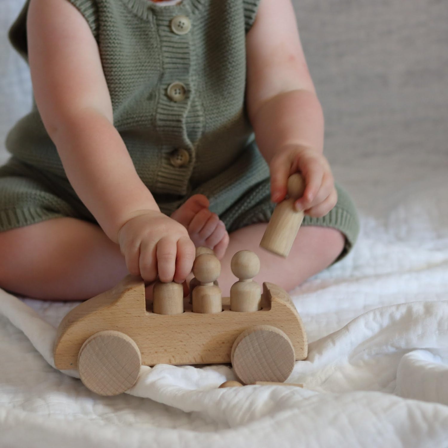 - Unpainted Wooden Car: Beautifully crafted large wooden car with 6 removable figures.
