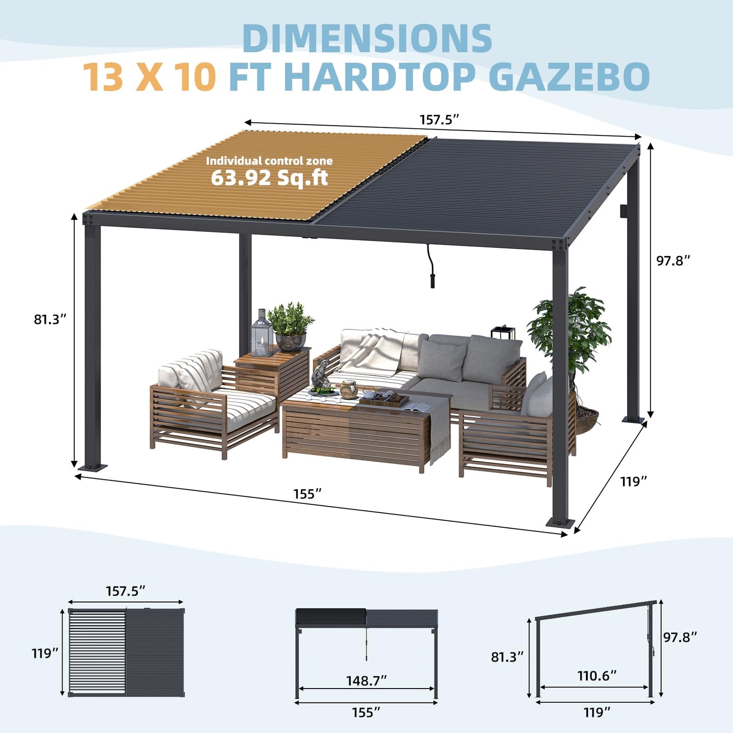 - Dual 64 sq.ft. Independent Adjustable Zones: The louvered pergola features precision-engineered adjustable blades, allowing seamless adaptation to weather conditions. Bask in unobstructed sunlight and expansive vistas on clear days, while effortlessly modulating shade coverage during inclement weather—ensuring optimal comfort across seasons and climates