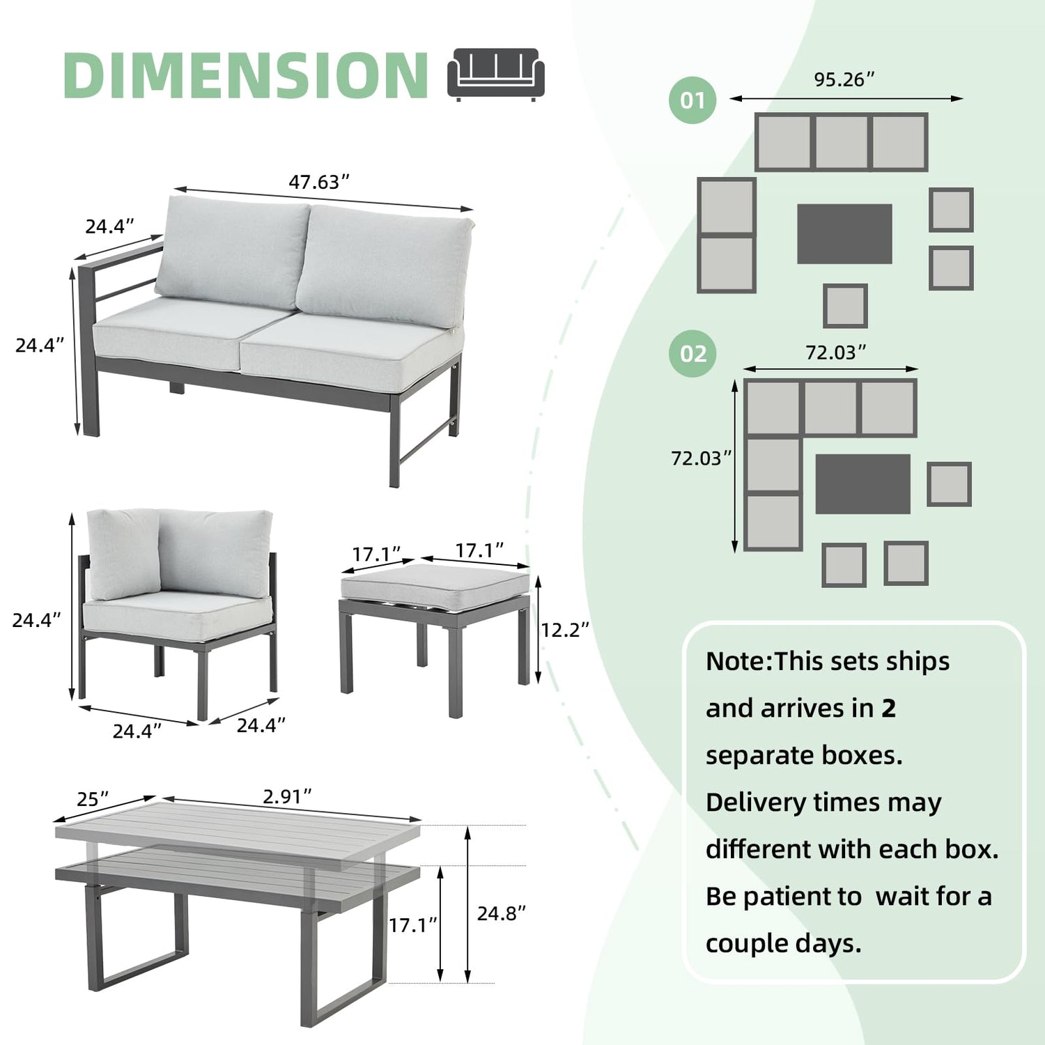 - 【Multiple Combination Modes】 - Our aluminum patio conversation set contains four furniture parts, including one right loveseat sofa, one left loveseat sofa, one corner loveseat sofa, one coffee table. You can combine them at will according to your mind or different occasion. If you own one, you will own multiple styles of outdoor sofa sets!