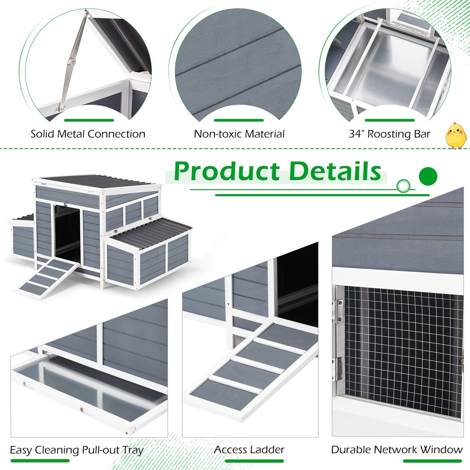 - Safe Material -- The large chicken coop is constructed by premium natural fir wood and painted with non-toxic varnish, the original wood is firm and natural for your beloved pet.