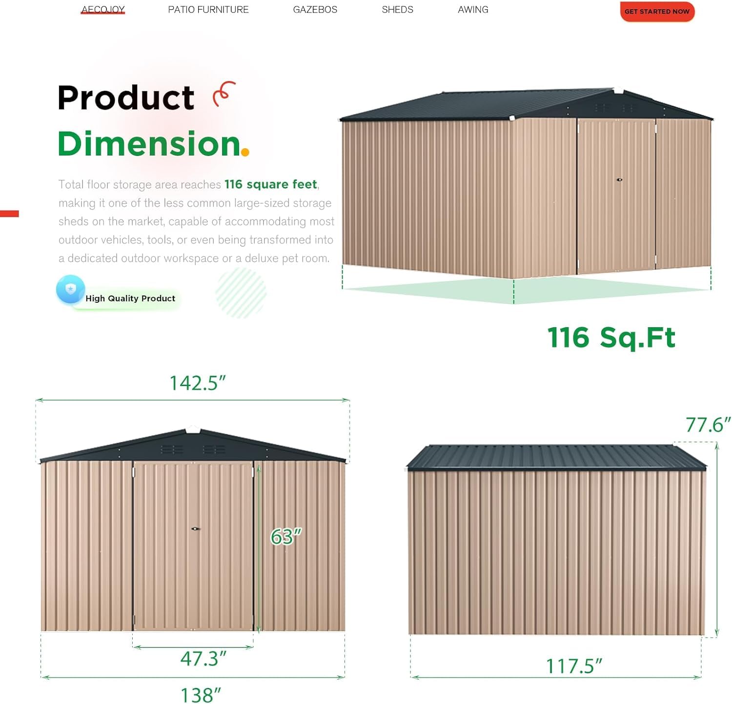 AECOJOY Shed 12' x 10' Outdoor Storage Shed for Ourdoor, Extra Large Metal Steel Yard Shed with Design of Lockable Doors, Utility and Tool Storage for Garden, Backyard, Patio, Outside use