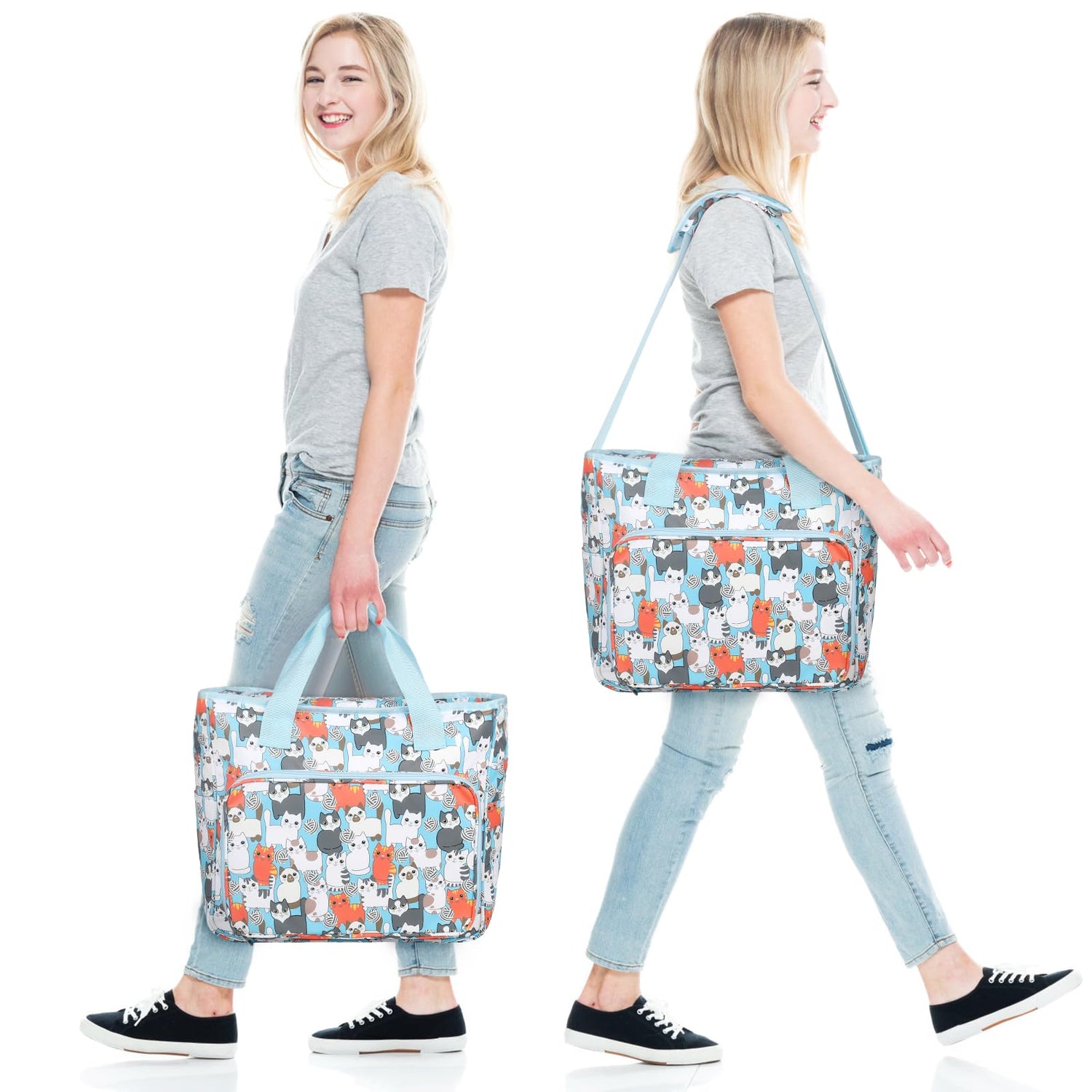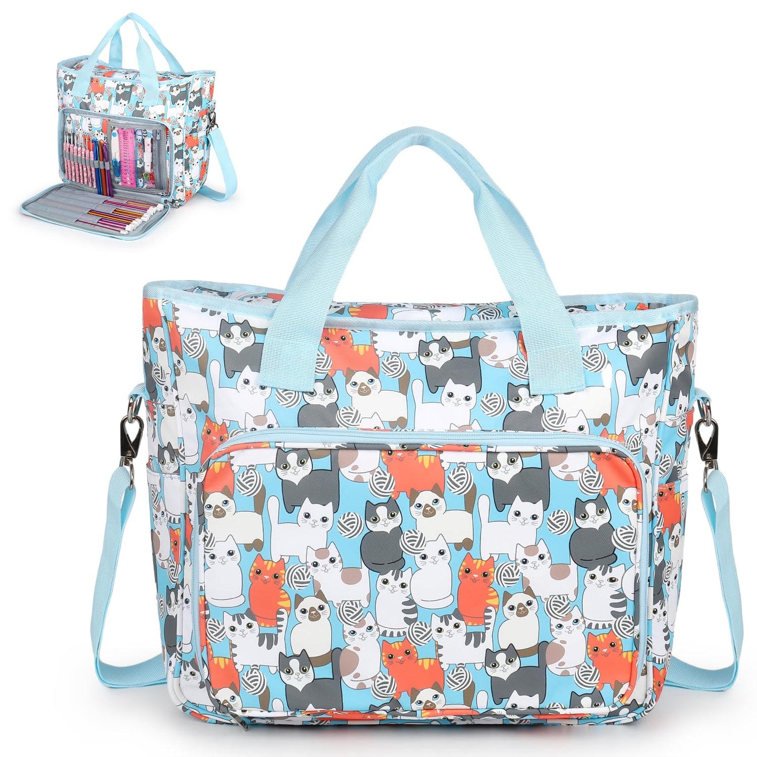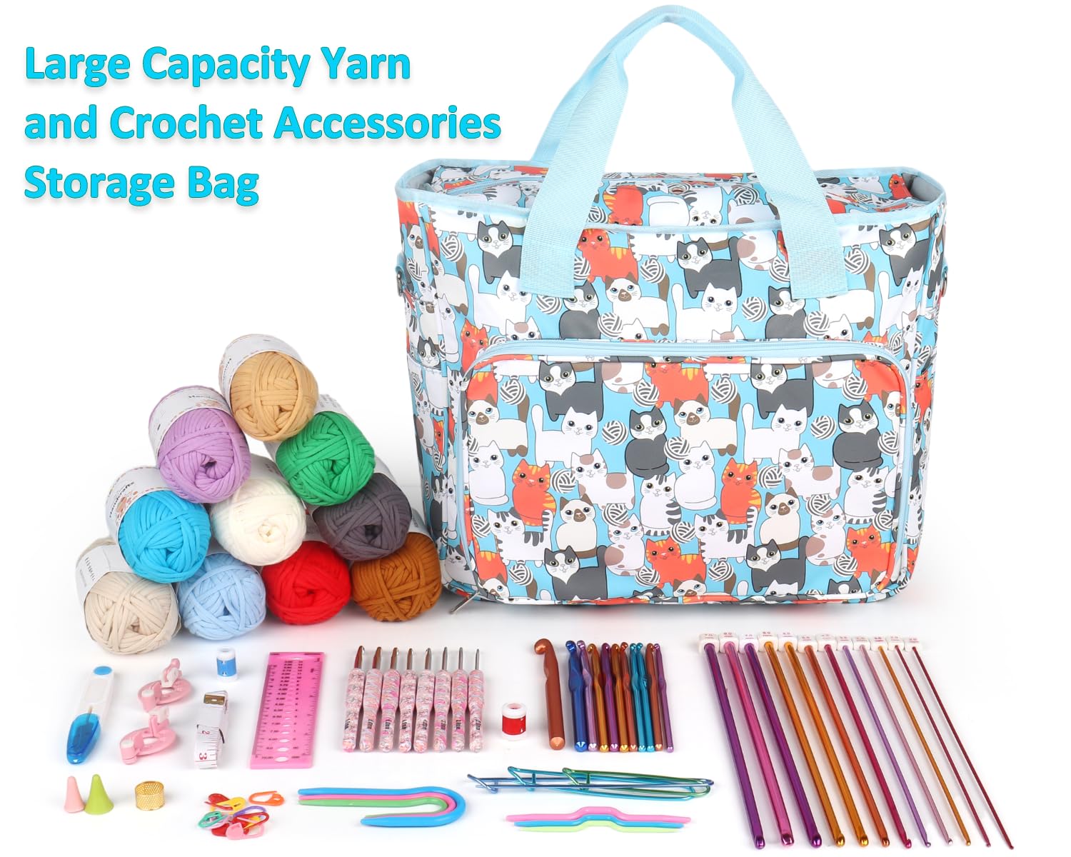 Aeelike Yarn Storage Organizer Travel Crochet Bag, Large Capacity Tote Bag Knitting Bag for Carrying Projects, Knitting Needles, Crochet Hooks and Yarn, Cute Blue Cat