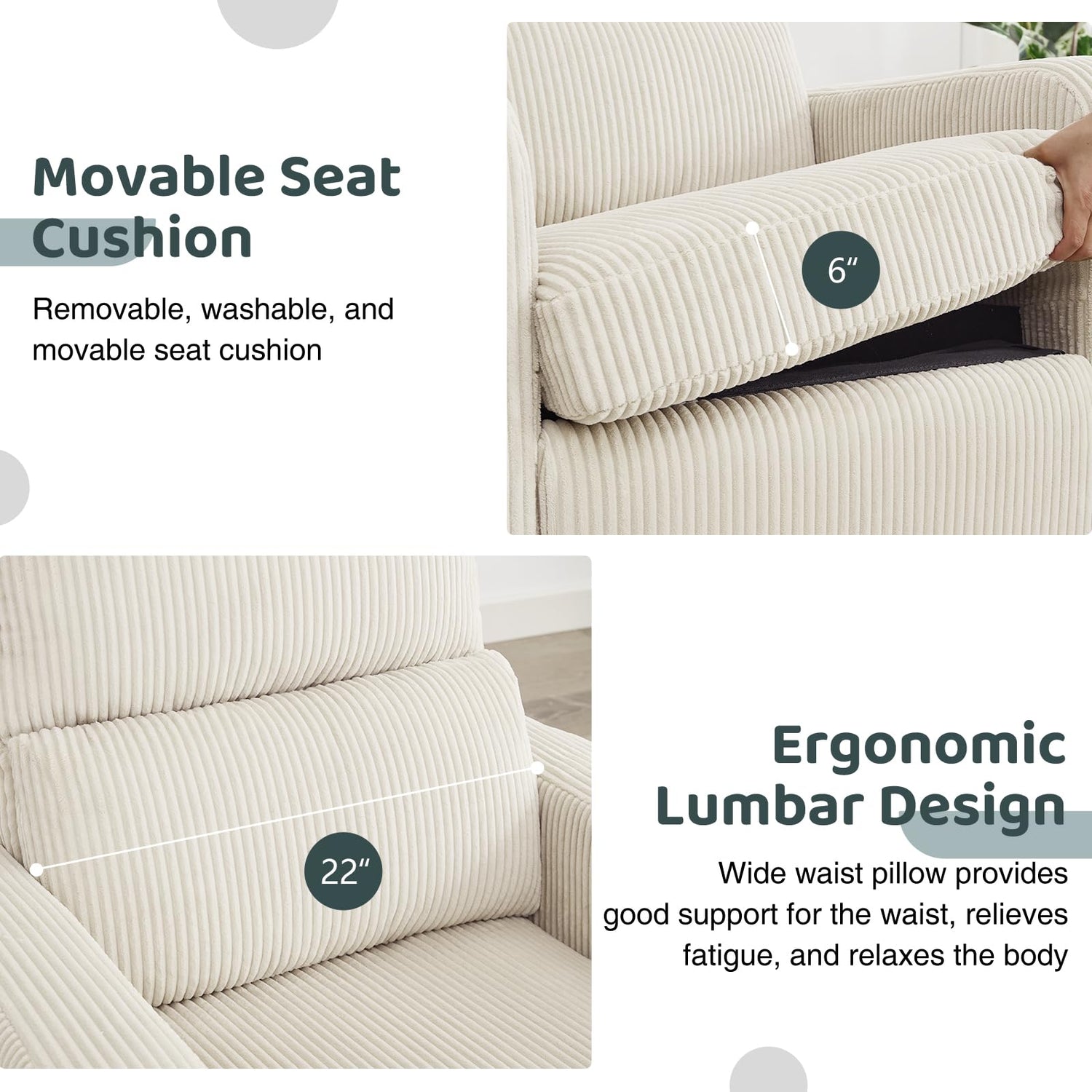 - 【Comfort Pillow Backrest】Swivel glider recliner designed for exceptional comfort and durability. Upholstered in skin-friendly fabric , the high backrest and seat maintain their shape for lasting support. With ergonomic lumbar pillow support and multiple reclining positions, this swivel rocking nursery recliner ensures relaxation and comfort in any setting.