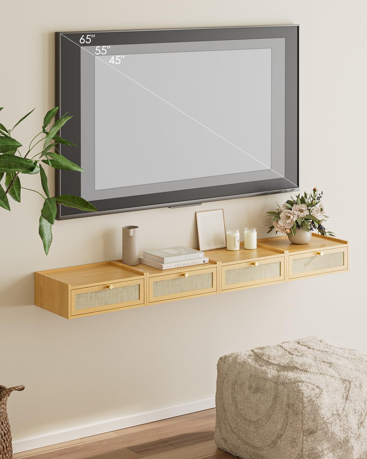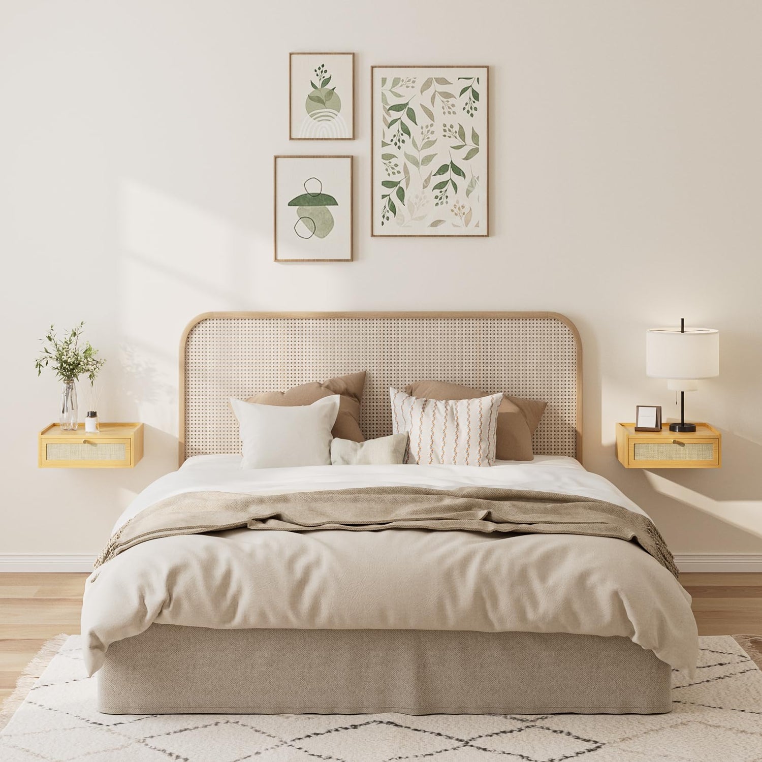 - Space saving: The small floating bedside table saves you space under the bedside table. The size is 13.39 "D x 17.32" W x 7.09 "H, which can be adjusted according to the height of your bed, allowing you to reach out and turn on the desk lamp. You can place anything under the rattan night stand, even a sweeping machine, without worrying about moving the cabinet or scratching the floor. It will not accumulate dust and is easy to clean.