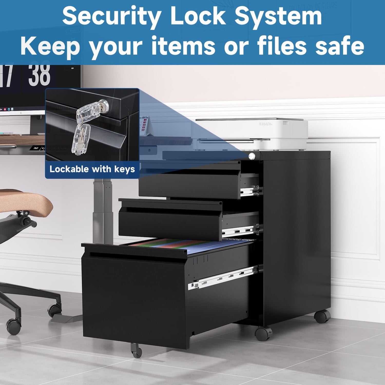 - FILING CABINET with LOCK▶▶AFAIF 3-drawer file cabinet with 1 lock for the first drawer. The locking system uses one key to secure all 3 drawers, which can keep the file safe and prevent the cabinet from tipping in case the file cabinet is overloaded. The lock with 2 backup keys of this vertical file cabinet adds more security to important files, keeping your business private.