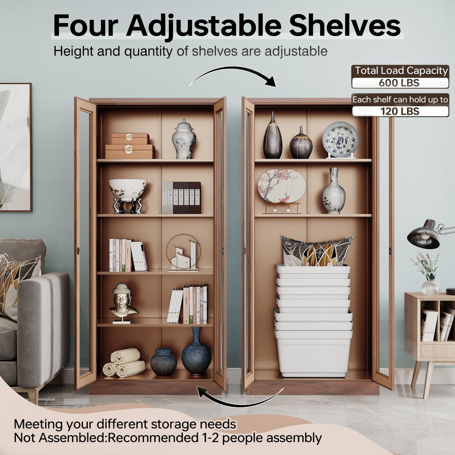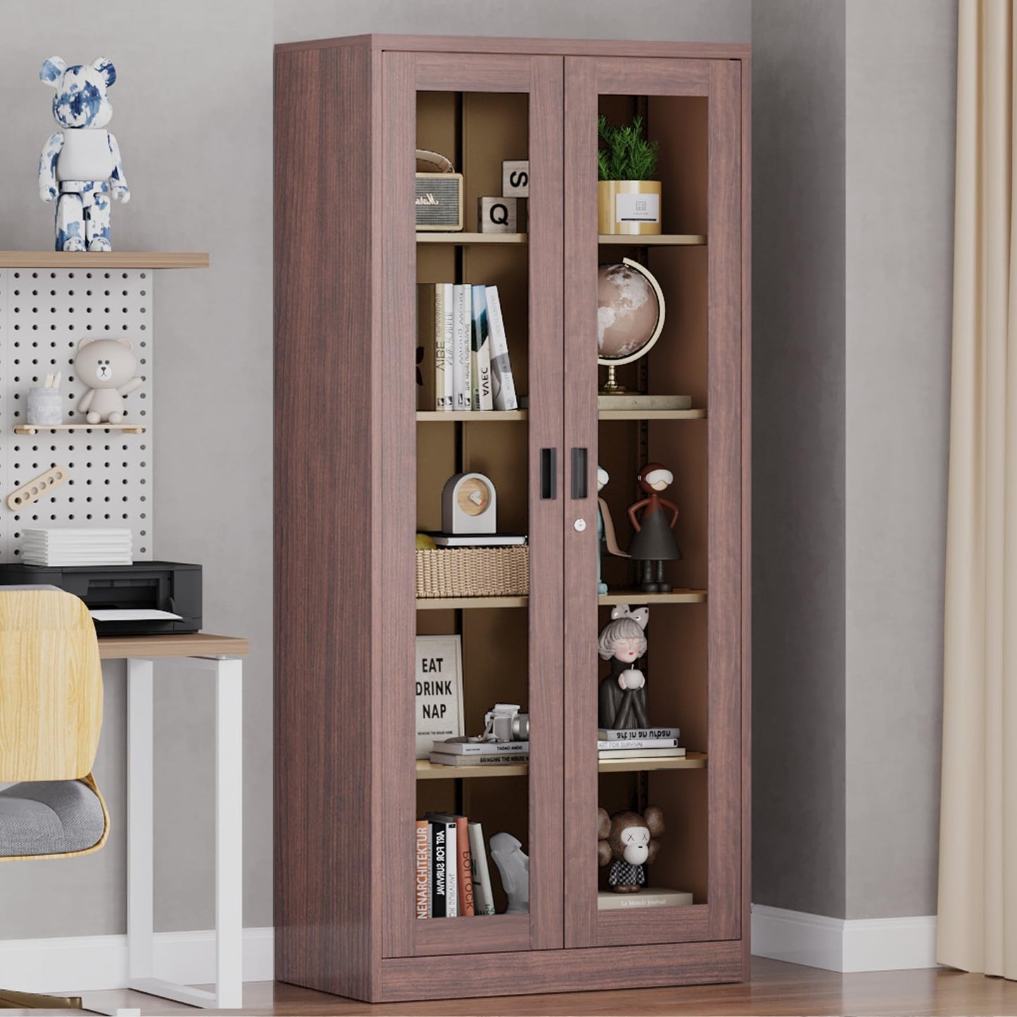 AFAIF 71" Tall Brown Metal Storage Cabinet with Glass Doors and Adjustable Shelves