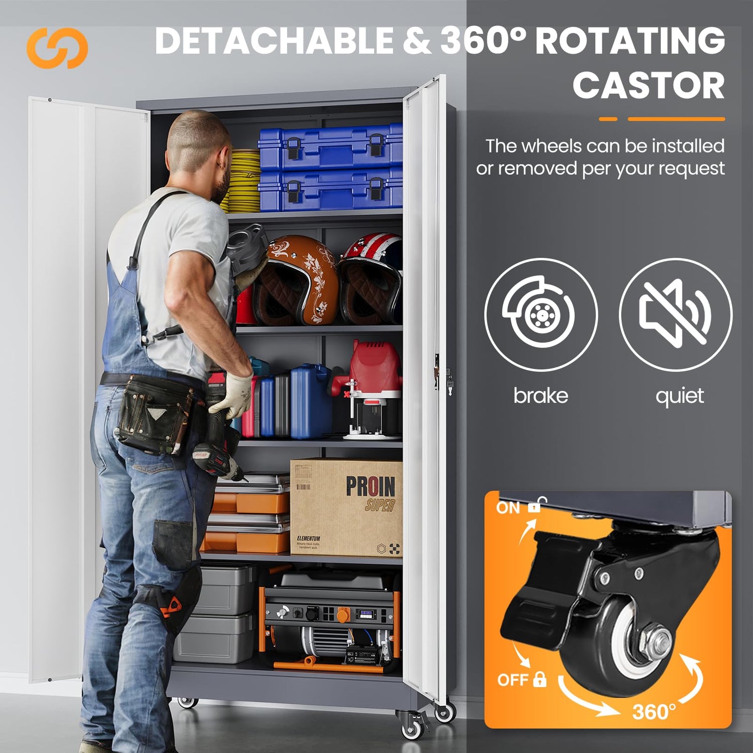 AFAIF Garage Cabinet with Wheels and Adjustable Shelves, Metal Garage Storage Cabinets with 2 Doors, Storage Caninet with Lock, Large Tool Cabnet for Workshop/Home/Office-(Gray White 75”H)