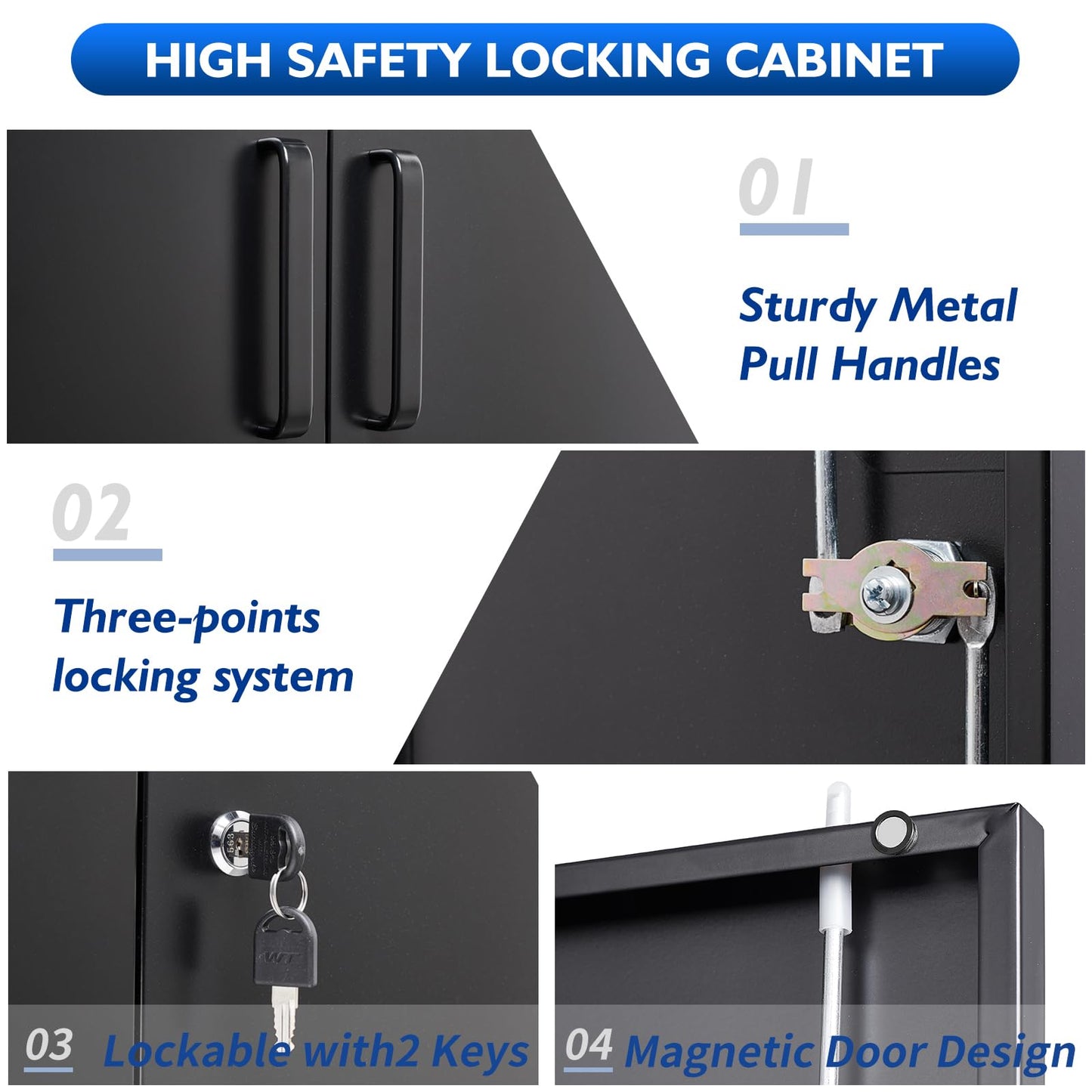 - 【FULL STEEL CONSTRUCTION】- Our metal cabinet is made up of a full steel plate. All the steel plates adopted an environmentally powder-coated finish, which not only makes it easy to clean up but also has a better capacity to resist corrosion and rust. It is a great storage solution for any garage, kitchen, utility room, office, or laundry room.