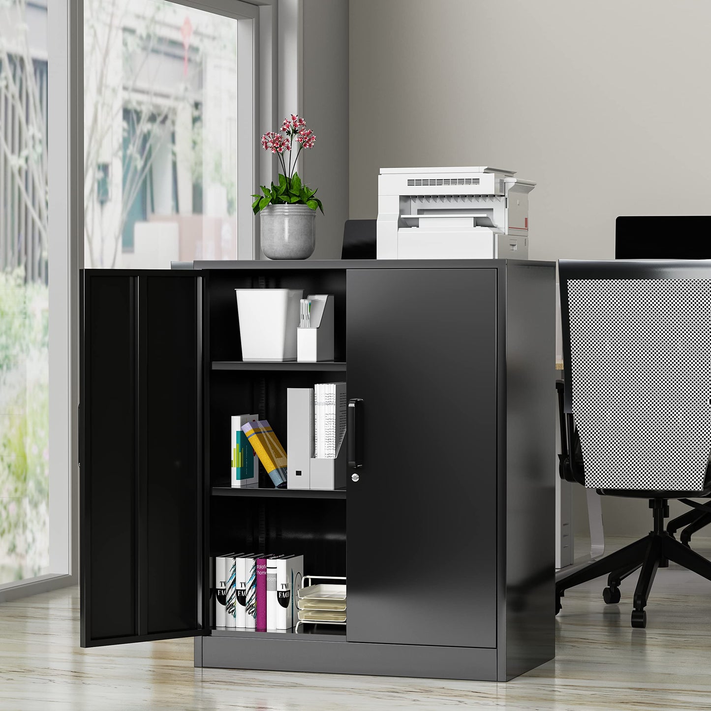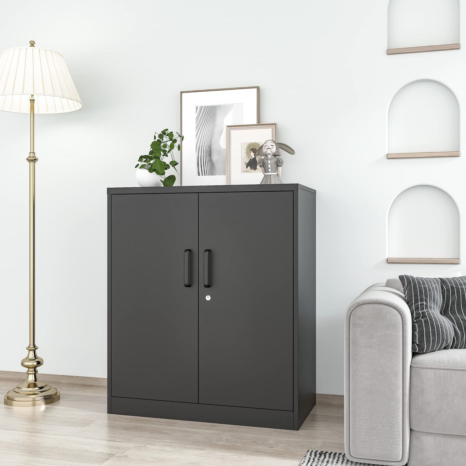 AFAIF Metal Storage Cabinets with Locking Doors&2 Adjustable Shelves, Lockable Steel Office Cabinet, Black Counter Cabinet Small Locking Cabinet Locked Tool Cabinet for Home, Office, Garage, Hallway