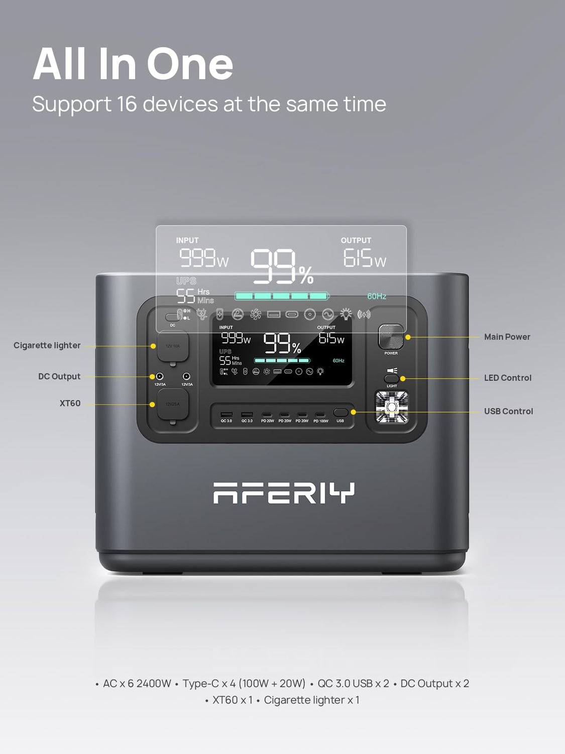 - 【 16 Ports - for all 】 AFERIY portable generator supports up to 16 devices that are charged at the same time. It has all the ports you need to charge your devices and appliances. Include: 6* AC outlet, 4* USB, 4* Type-C (20W + 100W), 2* DC5521, 1* car charging outlet, 1* XT60.
