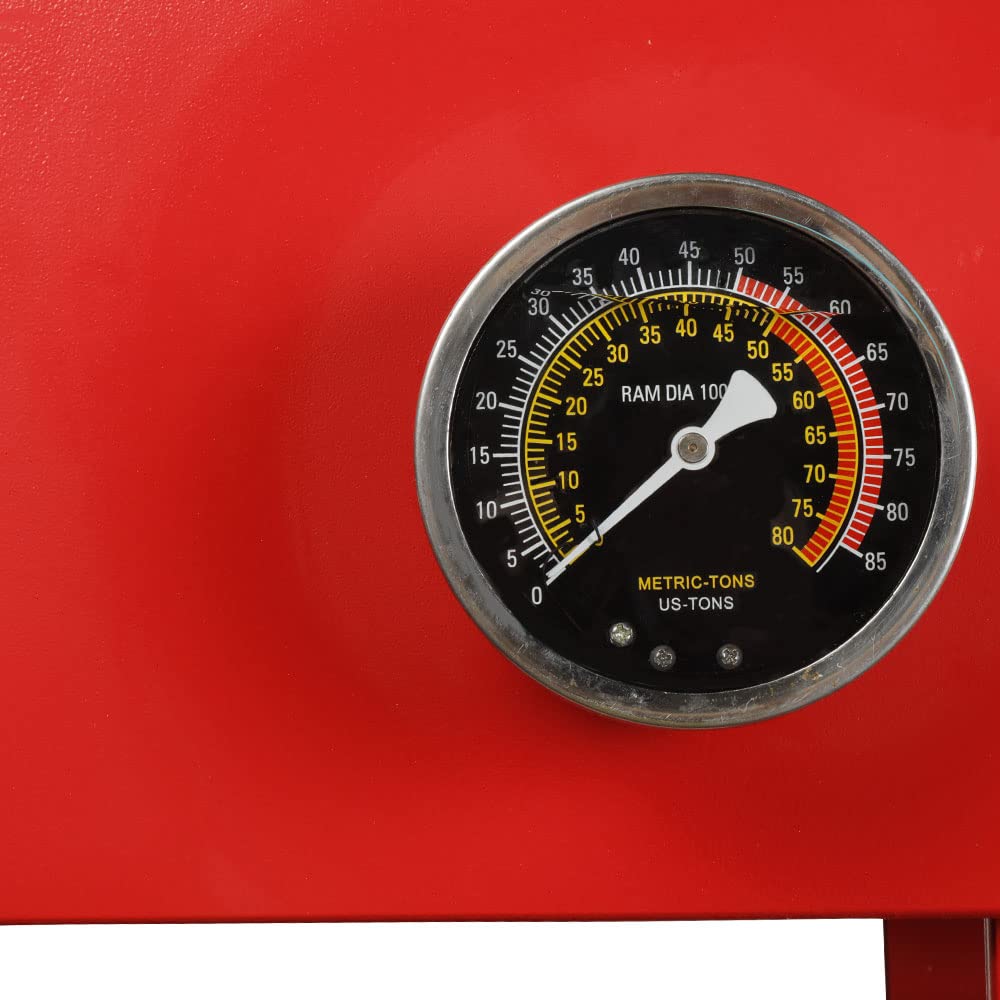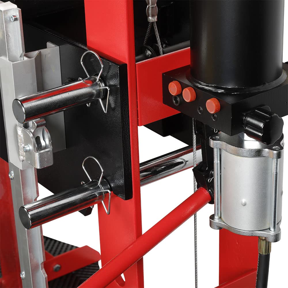 Details: Super Duty: This shop press is designed for straightening, bending, pressing, and stamping; The tool comes with a heavy duty cable winch system for effortless bed adjustment. Motor: The large liquid filled glycerin gauge accurately shows pressing force; In addition, the dual air motor operation helps and guides with the faster pressing process. Features: Made with a shatter resistant polycarbonate guard for added operator safety; This super duty, shop press includes a 2 piece press plate set and 10 piece pin and bearing press adapter set. .