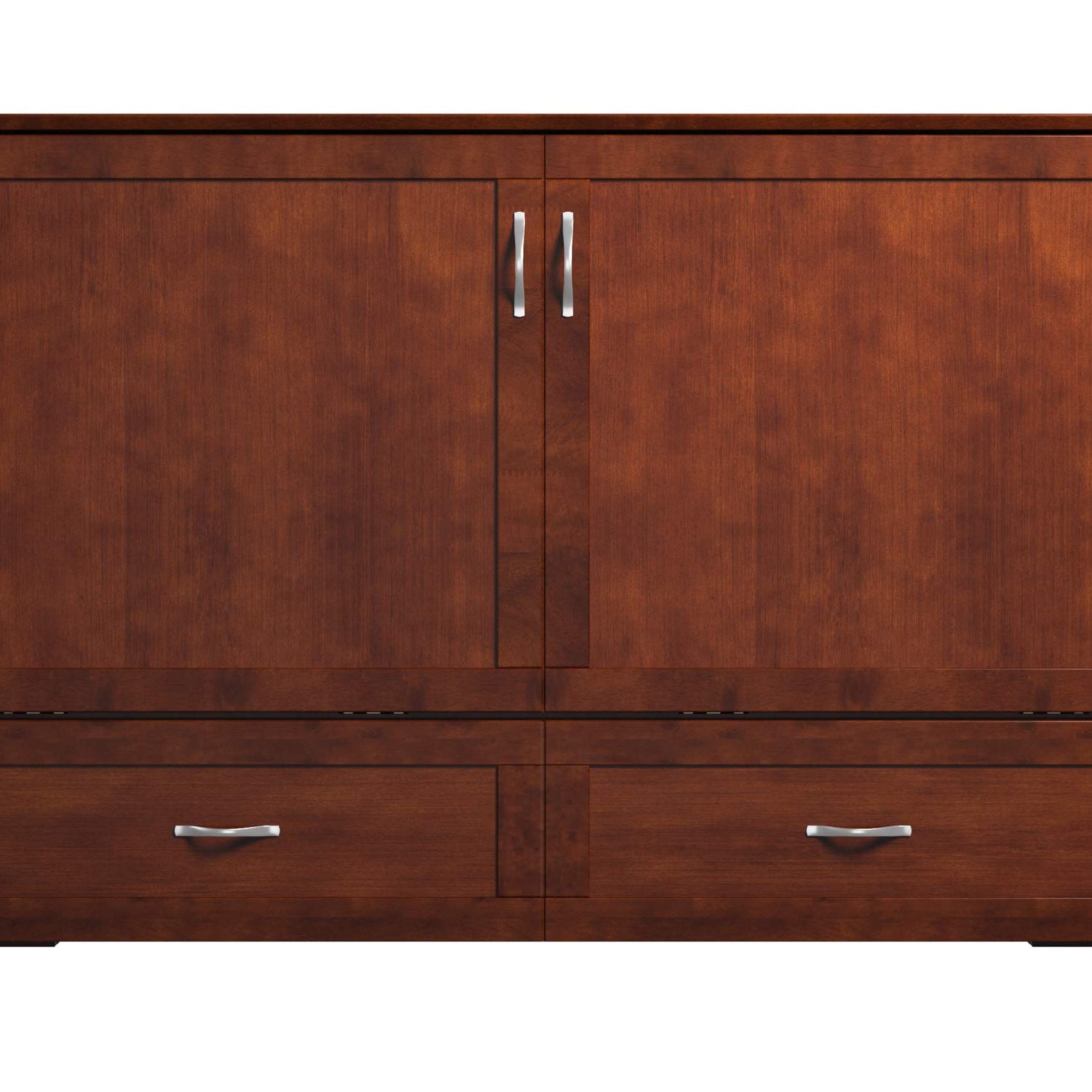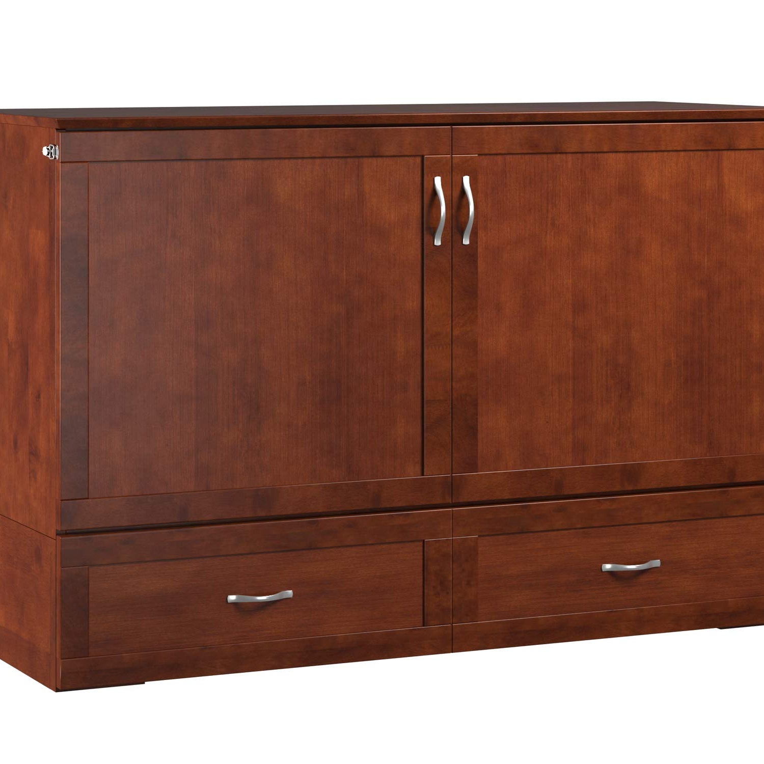 Details: A traditional piece with contemporary convenience, the Hamilton Murphy Bed Chest will have your guests awed. This classic, unassuming chest can transform into a queen-sized bed in minutes. Just unlatch and fold down the front cabinets, unfurl the folding memory foam mattress inside, and voila! Closing up is just as simple. Say goodbye to your days of wrestling with a fold-out couches and deflating air mattresses. Hosting overnight guests doesn't have to be hard with a Murphy Bed Chest.