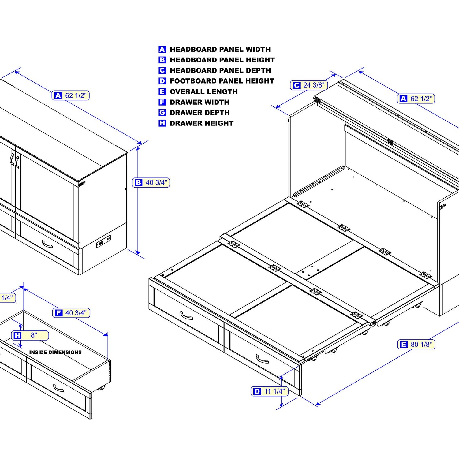 - ASSEMBLED DIMENSIONS (CLOSED): 24.38"L x 62.5"W x 40.75"H; ASSEMBLED DIMENSIONS (OPEN): 80.13"L x 62.5"W x 40.75"H; WEIGHT CAPACITY: 800 lbs; Mounting is not required