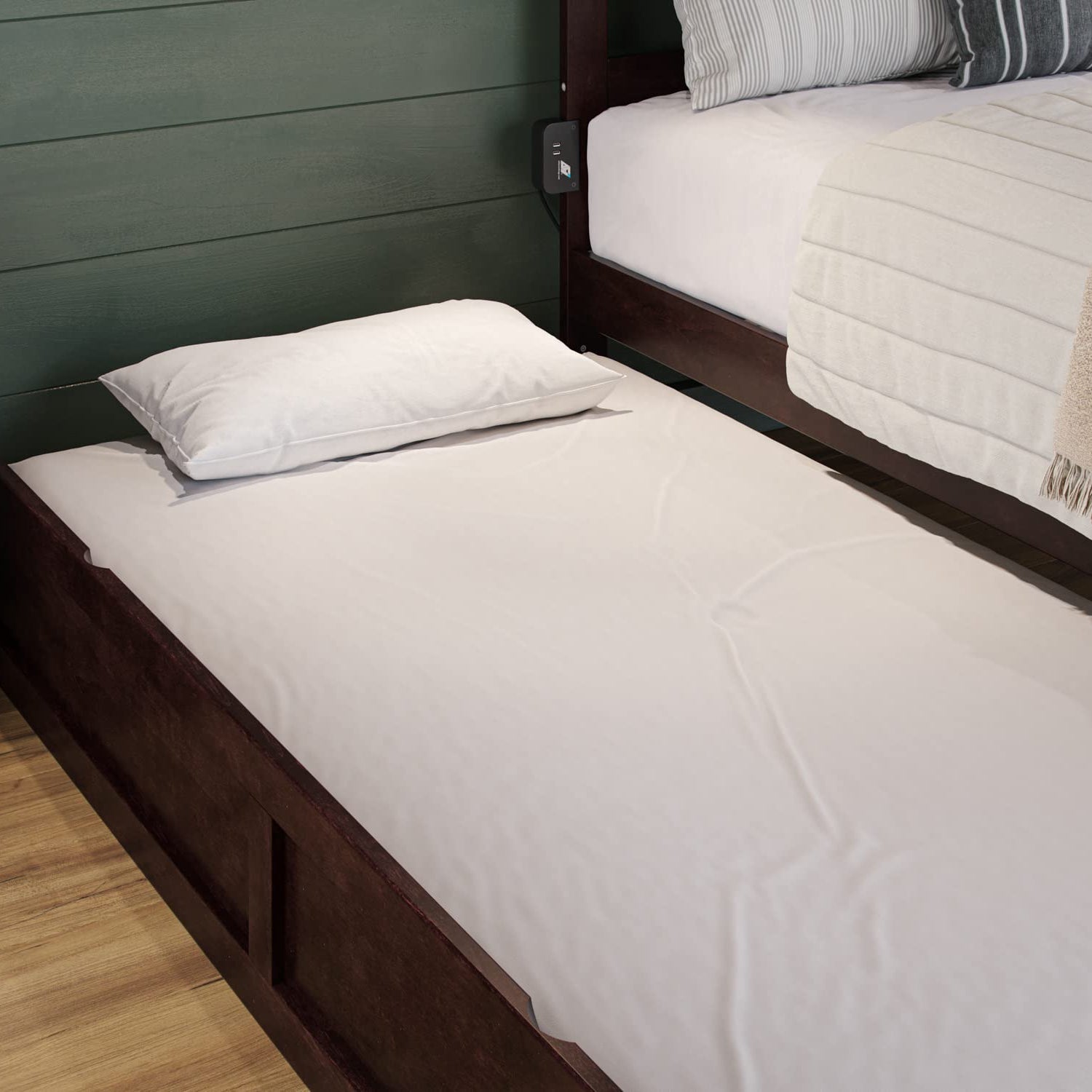 - BED & TRUNDLE FEATURE SOLID HARDWOOD AND VENEERS WITH A CLEAN FINISH: Trundle can accept a mattress height of up to 7", rolls easily on wheels and can be positioned on either side of the bed
