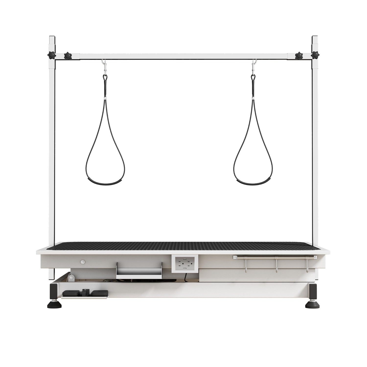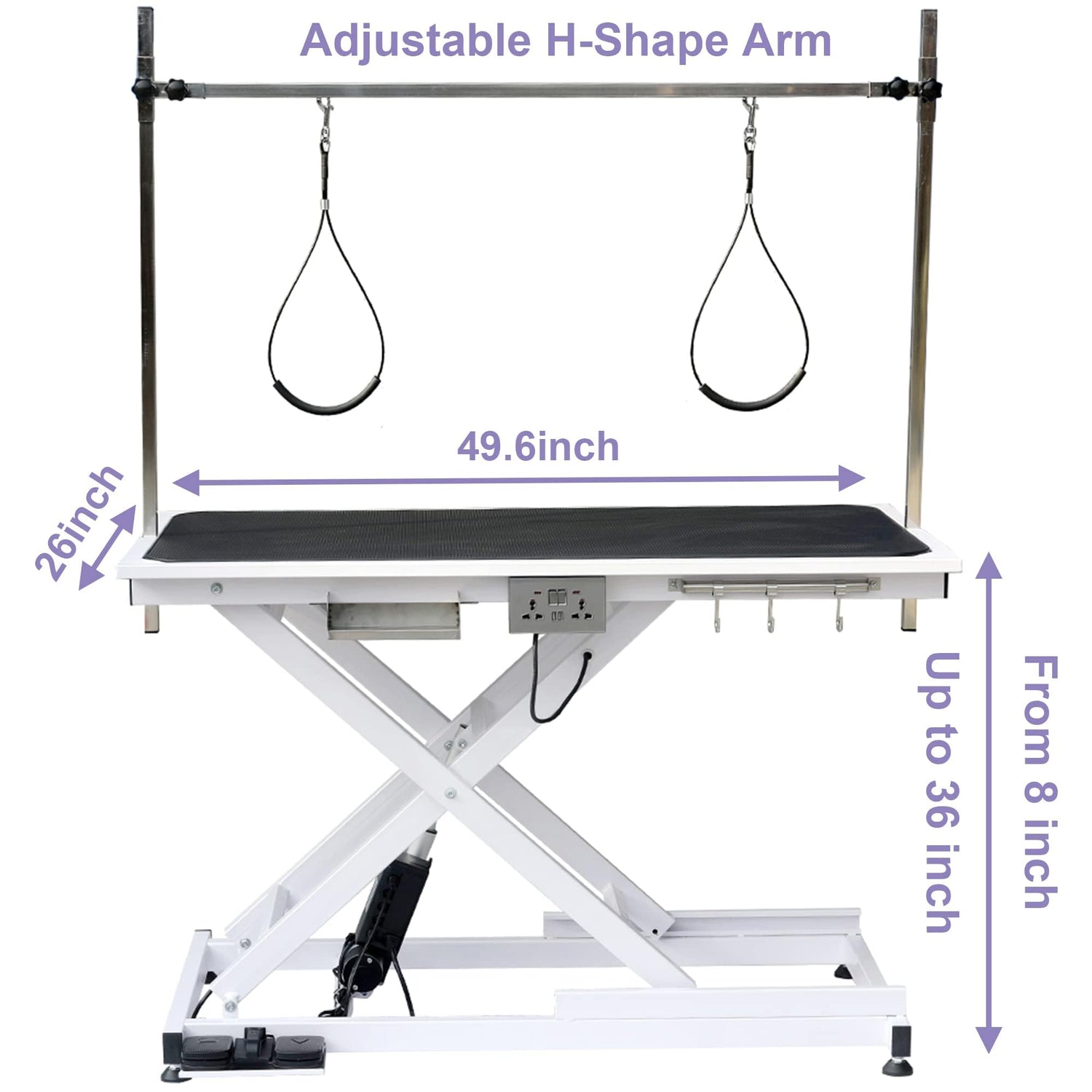 - 【Dimension & Additional Details】Pet Grooming Table Dimension: 49.6 x 26 x 36 inch (L x W x H); The adjustable base and arms and a variety of accessories ensure easy grooming for both pet and groomer. The storage box allows you to carry your grooming tools with you; the additional AC outlet and USB port allow for easy access to your pet's grooming equipment.