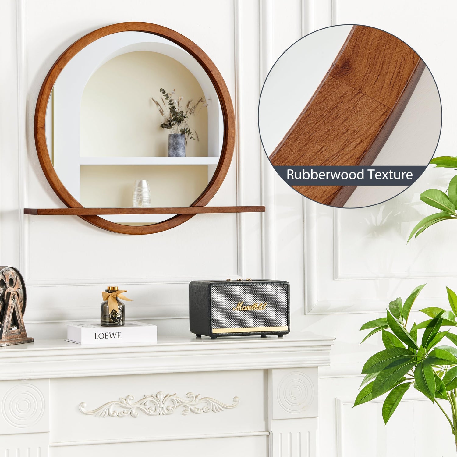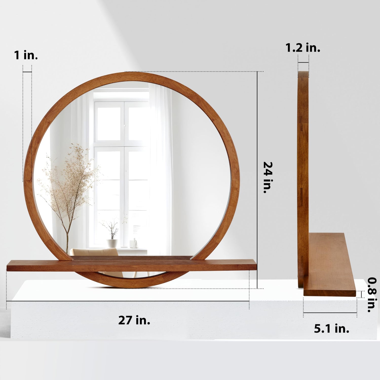 AGATEO Solid Wood Wall Mirror with Shelf – Round Wood Frame Mirror for Entryway, Bathroom or Living Room – Handcrafted Look – 24 Inch