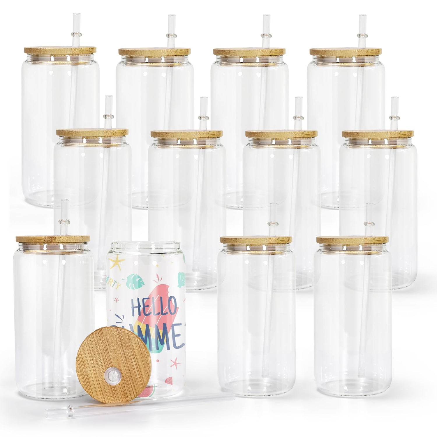 - 12 Pack Clear Sublimation Glass Cups - Come with 12 pack glass sublimation tumblers, 12 pcs plastic straws, 12 pcs bamboo lid. You can make sublimation printing what you like and give your families or friends as a gift in summer. Wide Opening & Slim Body Design, easy to clean - Please note that this glass cannot be washed in the dishwasher. We will send you a replcement for free if there are damaged in any way upon arrival.