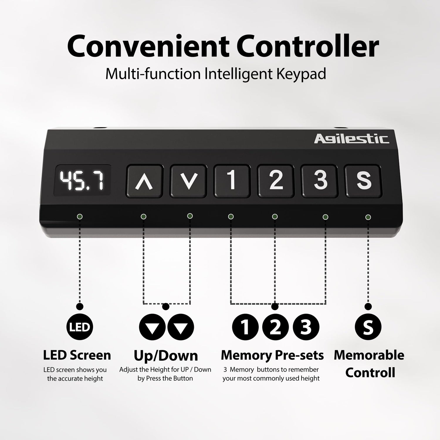 - User-Friendly Control Panel with Memory Presets Equipped with a smart control panel featuring several memory presets, allowing you to quickly adjust to your ideal sitting and standing heights for maximum comfort.
