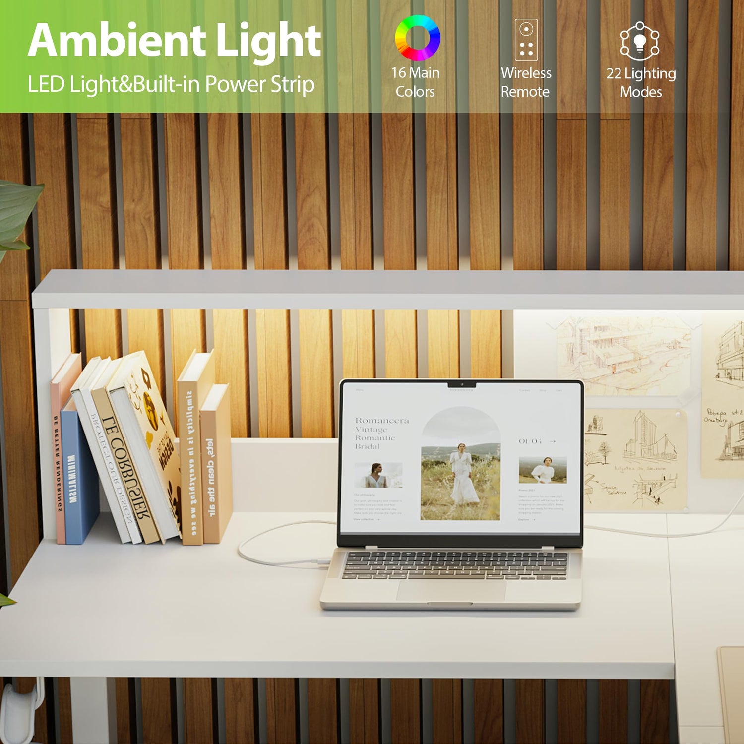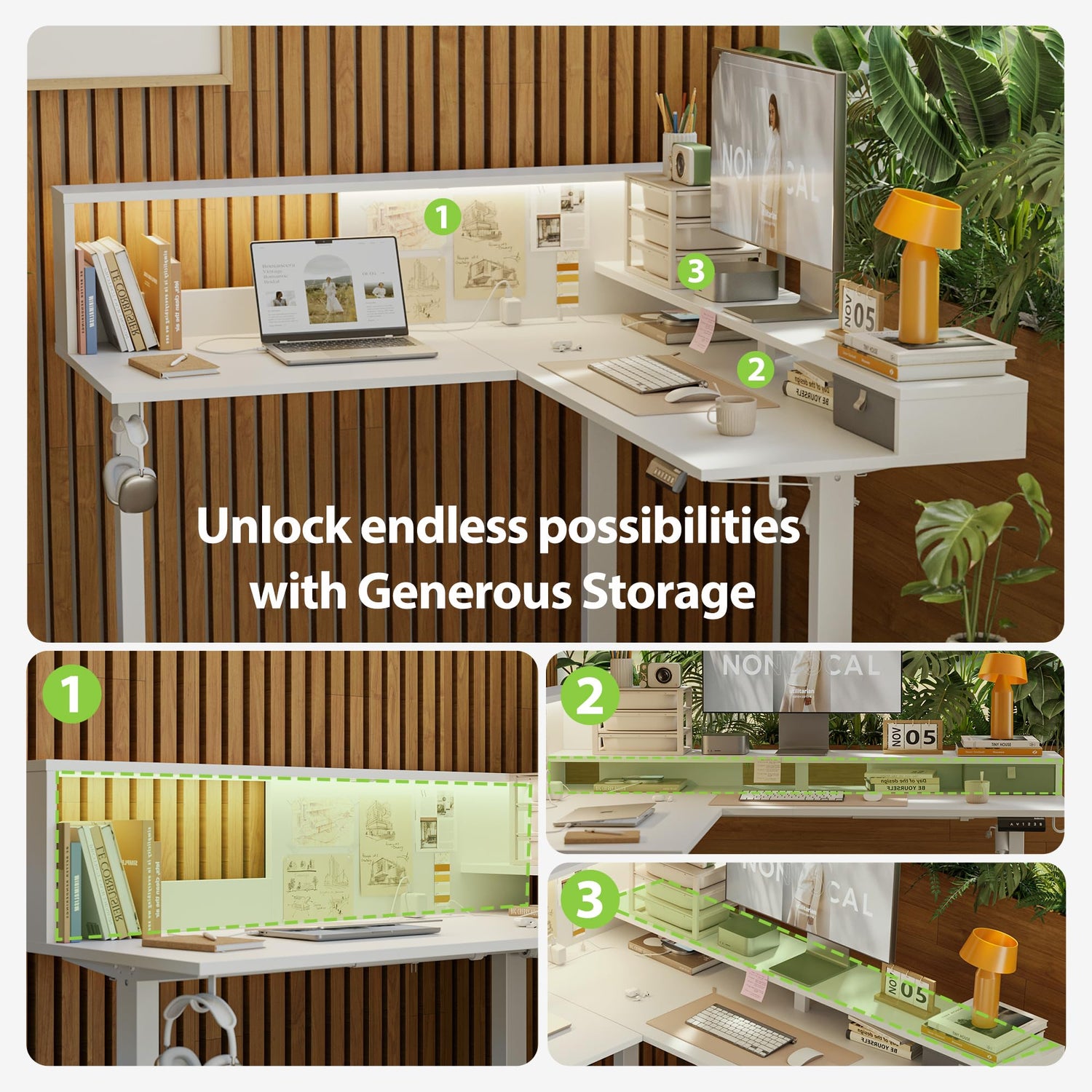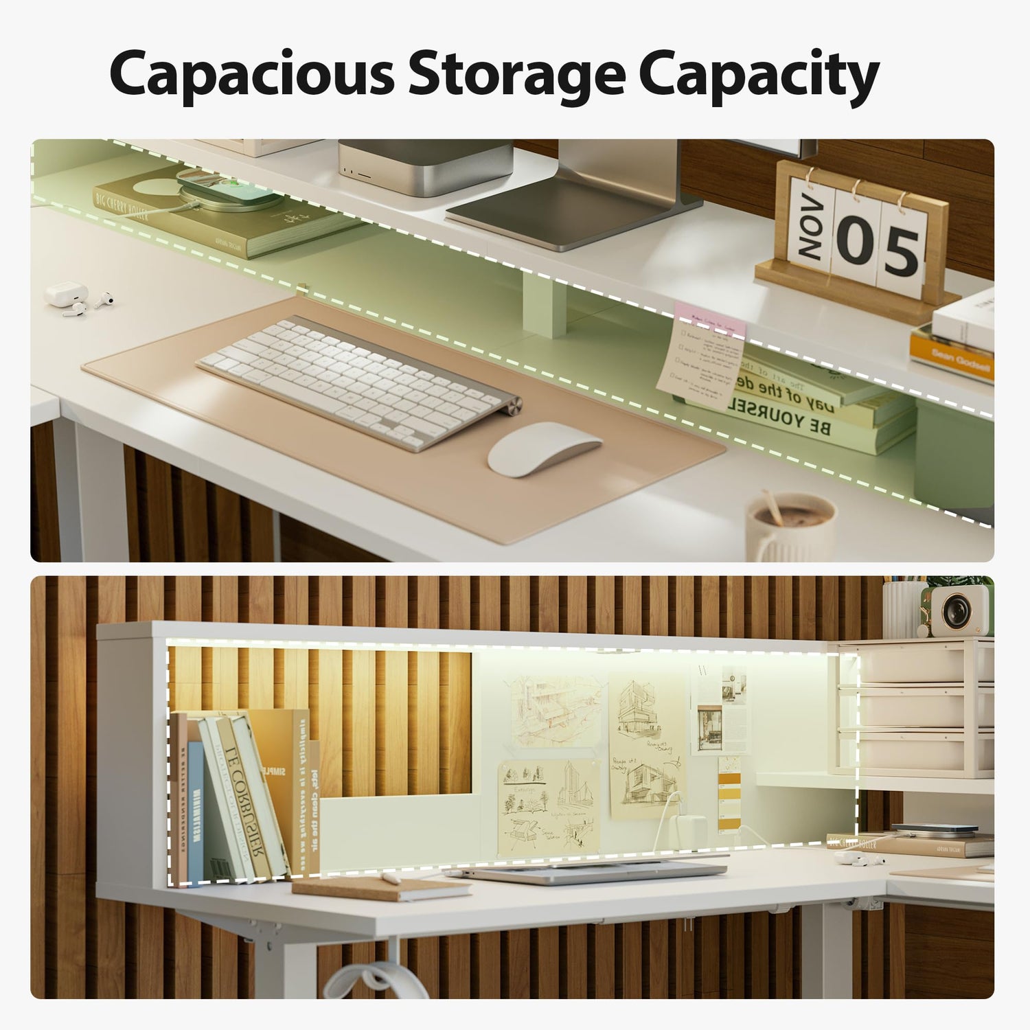 Agilestic L-Shaped Electric Standing Desk, 63x55 Inch Ergonomic Adjustable Height Desk with Storage, Stand Up Corner Desk Sit Stand Computer Table Power Outlet & LED Lights, Office Table, White