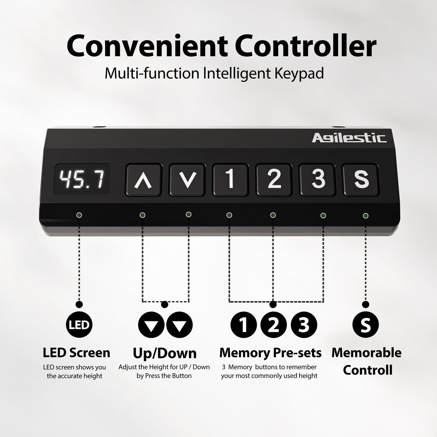 - 「Electric Adjustable Height 」Agilestic L-shaped standing desk has 6 buttons for your daily use, and 3 preset memory buttons satisfy your separate height requirements from 27.8" to 45.9". A variety of height choices satisfy your multiple tasks, both standing and sitting.