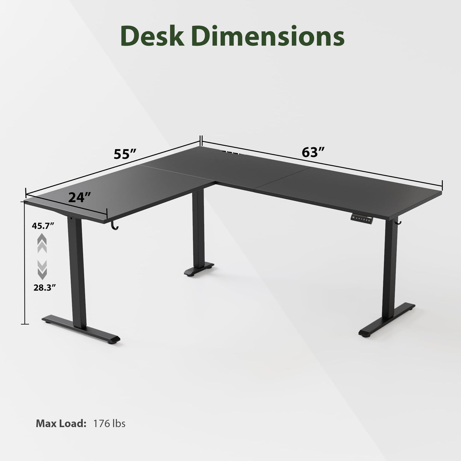- 「63" Ample Workspace」63*55" L-shaped adjustable height desk is perfect for home office and gaming by providing large space. Extra-large space easily holds 3 desktop PCs, 1 laptop, and other office accessories.