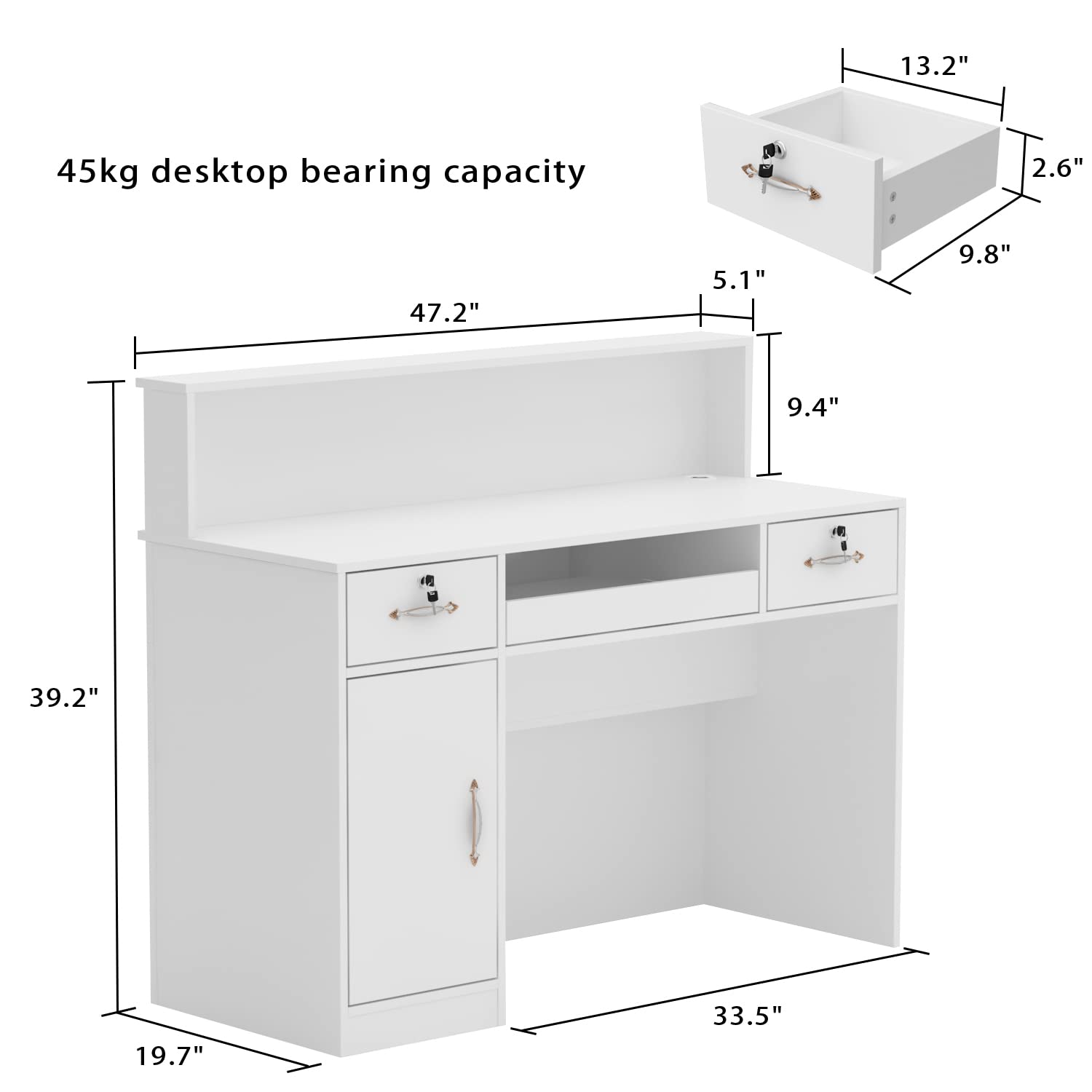 - [Ample Storage Space] - This retail checkout counter table features a side cabinet and 2 drawers for storing books, stationery and other office supplies to keep your workspace organized. The front of the reception desk has a shelf for decorations to create an attractive reception area. Front desk dimensions: 19.7"D x 47.2"W x 39.2"H