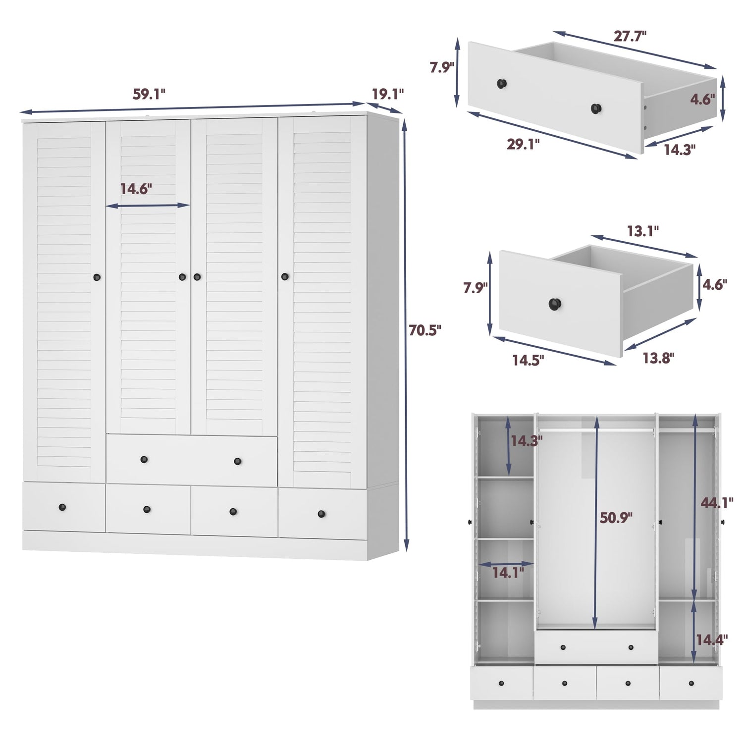 - [Large Capacity] - This armoire wardrobe closet comes with drawers, shelves and hanging rods to meet your multiple storage needs and create a well-organized clothing storage area. The hanging rod can store wrinkle-prone and daily wear clothing. Shelves for folded clothing and bags, and drawers for small items. Wardrobe closet dimensions: 19.1"D x 59.1"W x 70.5"H. Drawer dimensions: 14.3"D x 59.1"W x 4.6"H