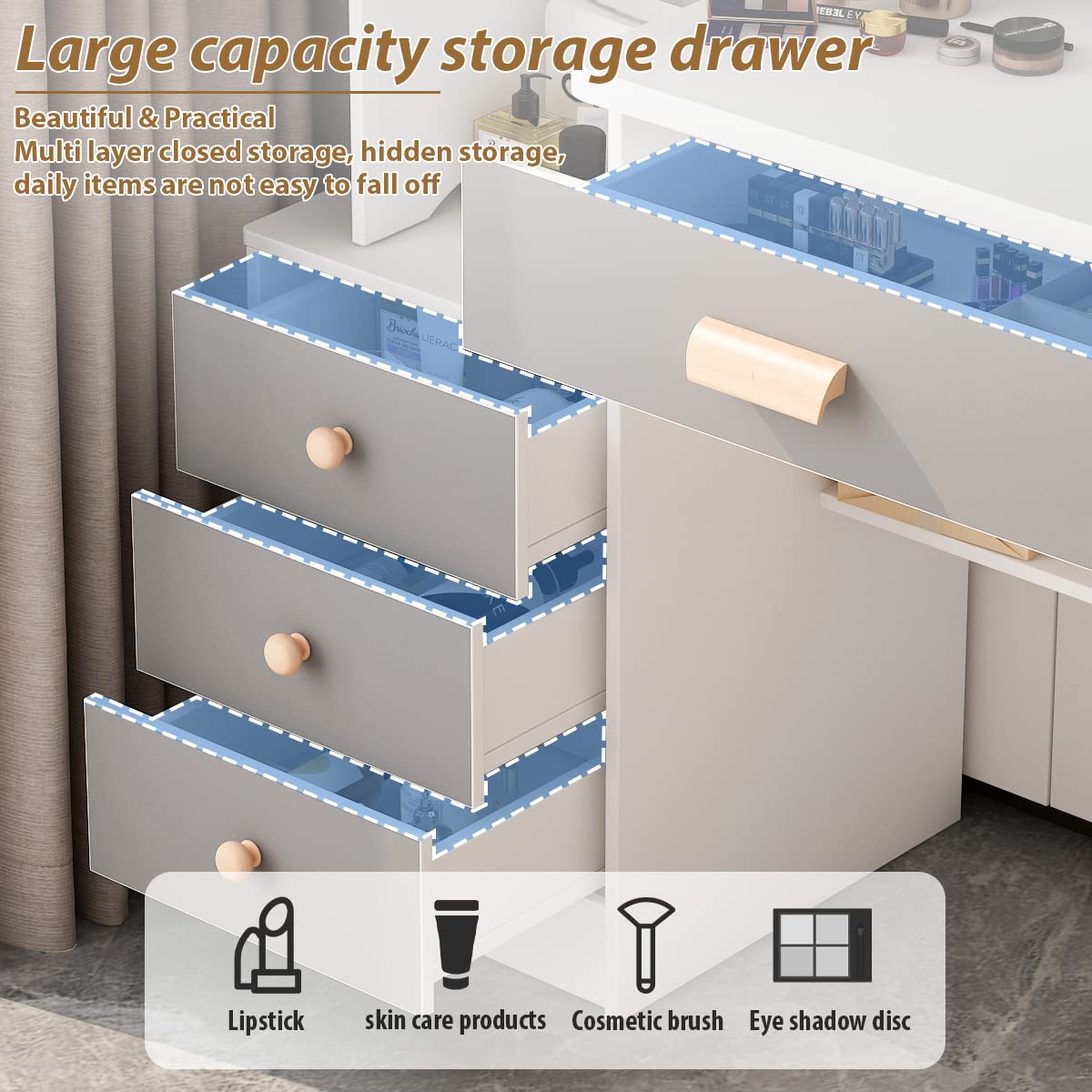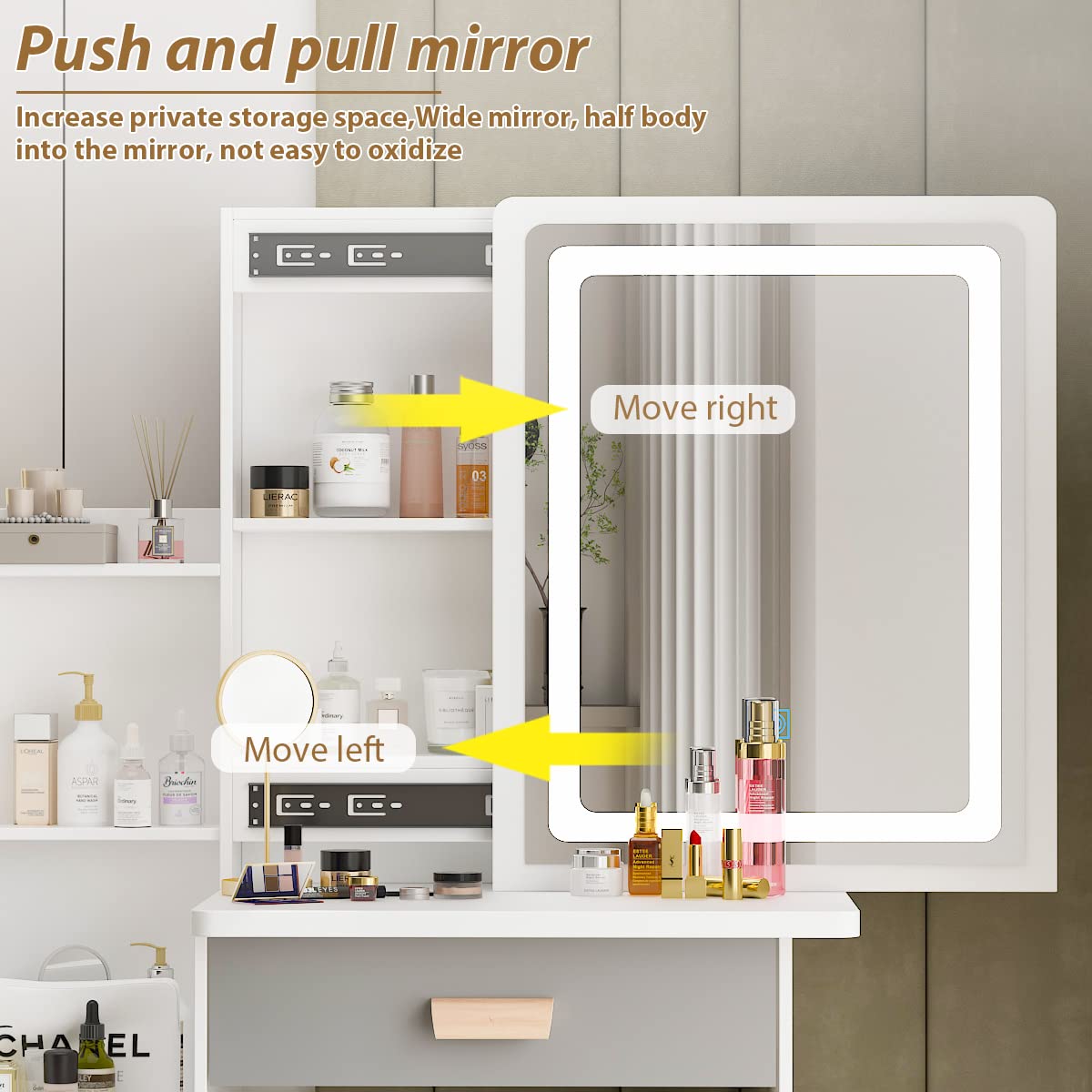 AGOTENI Small Vanity Table Makeup Vanity Dressing Table with Mirror, 4 Drawers & Shelves, Dressing Desk and Cushioned Stool Set (White/Grey, Slidding Lighted Mirror)