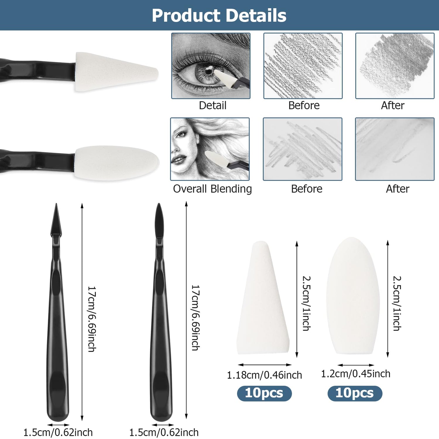 - Package inclusion : The package includes 48 pieces of blending stumps,the sizes are 5, 6, 7 and 8, 1 pieces for each size;blending stumps the sizes are 1, 2, 3, 4, 2 pieces for each size;tortillions the sizes are 1, 2, 3, 4, 2 pieces for each size; 1 pencil extension tool; 2 sandpaper sharpen pads blocks; 2 kneaded erasers,1 sketch rubbing sponge, 2 sketch wipe scrapers, 20 sponge replacement heads (10 oval and 10 pointed) and 1 felt bag.