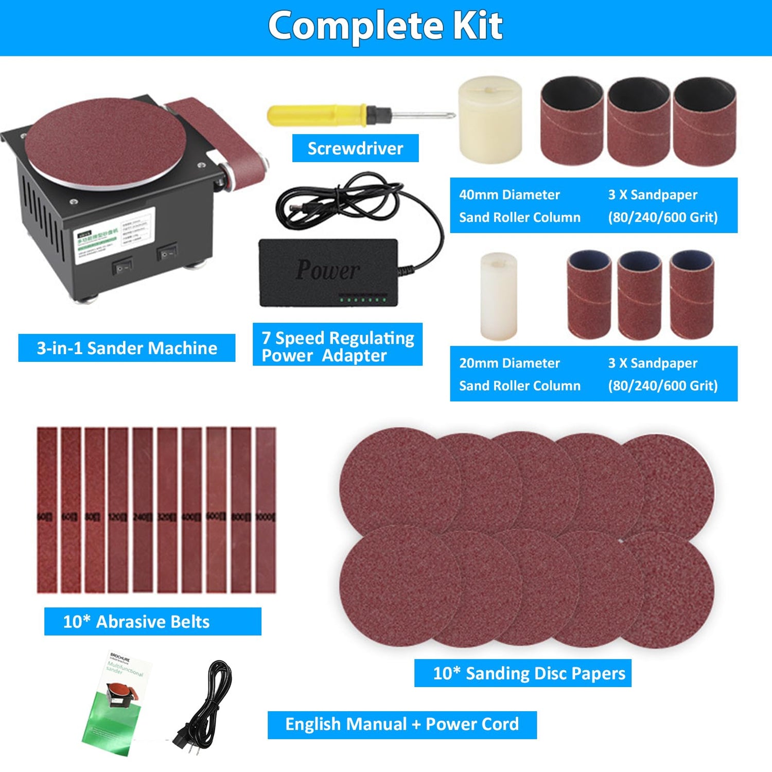 • 3-in-1 Sander: Equipped with 10 abrasive belts, 10 sanding disc papers, a 1.6"φ sand roller column with 3 sandpaper, a 0.8"φ sand roller column with 3 sandpaper, this sander can be used as a sanding machine, a belt sander, and a high-speed sanding roller