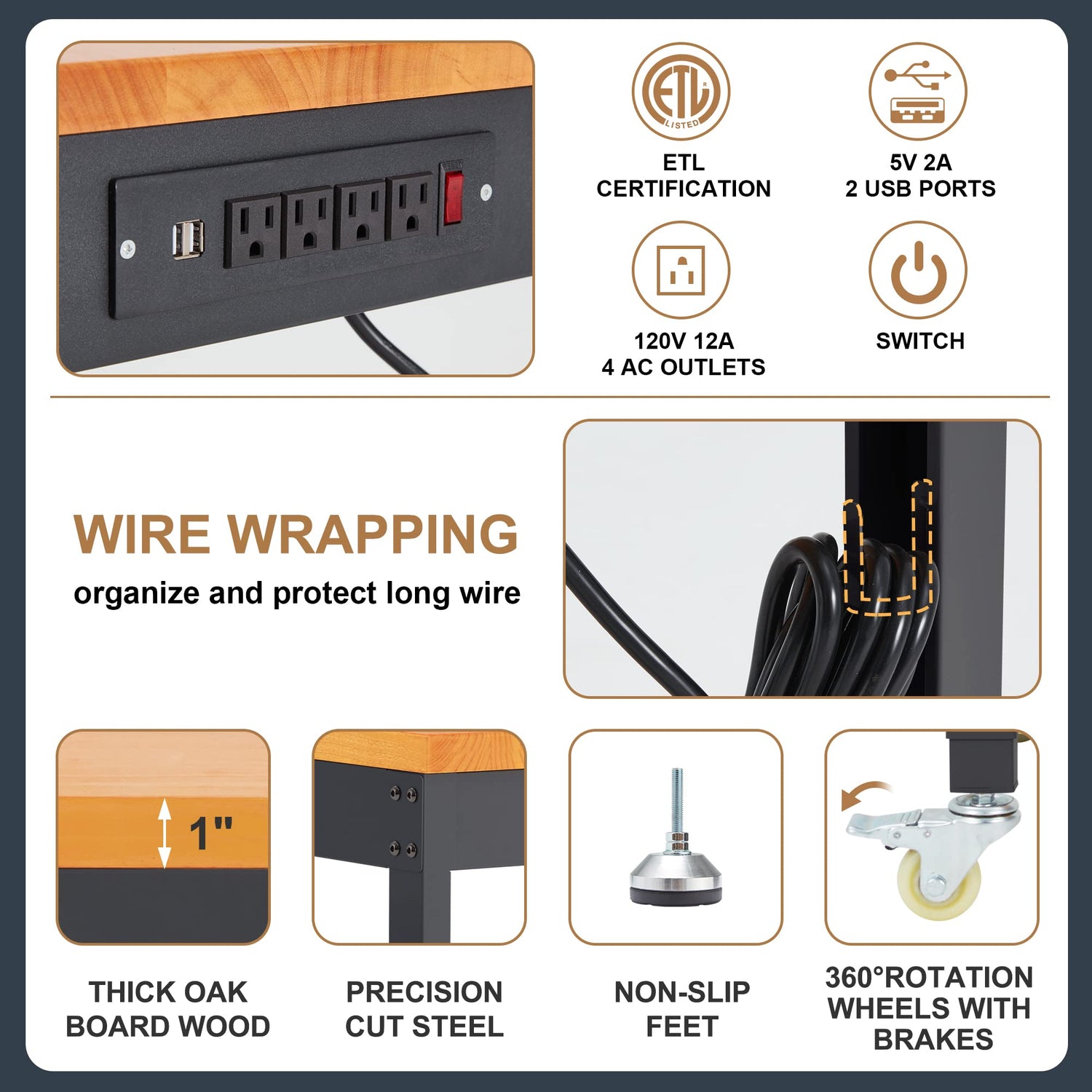 AHB 48" Rolling Workbench Adjustable Height, Oak Wood Work Table with Power Outlets, Max 2000 LBS, Heavy Duty Work Bench for Garage Office Home, with