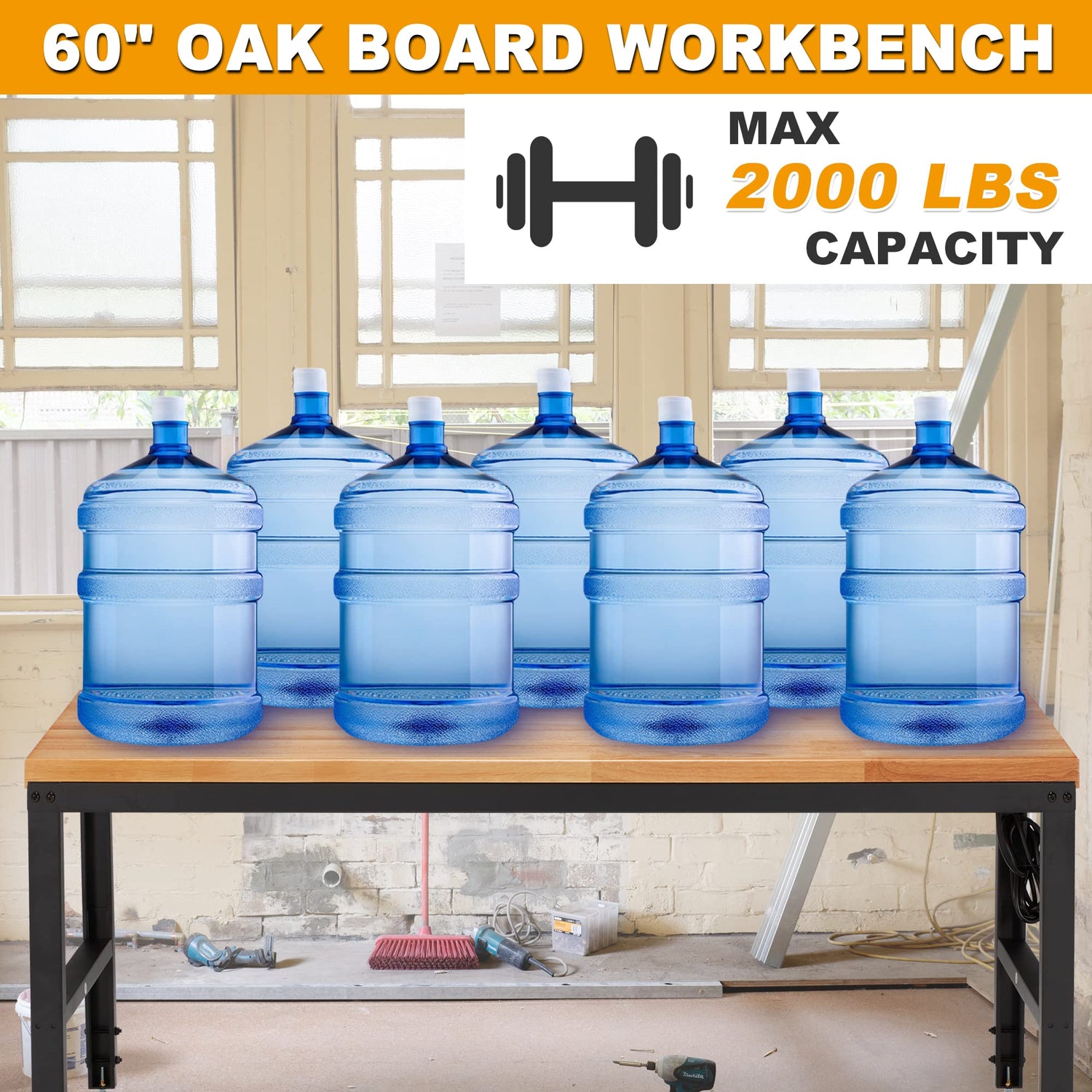 - 【SOLID OAK WOOD & STEEL FRAME】Workbench for garage specially selects solid oak wood for tabletop, coating with varnish of environmental protection, supporting longer service time. Combining with precision cut steel, the work bench holds a high load bearing capacity max 2000 lbs, ideal for projects ranging from gardening to car repair, such as hitting, dyeing, drilling and cutting.
