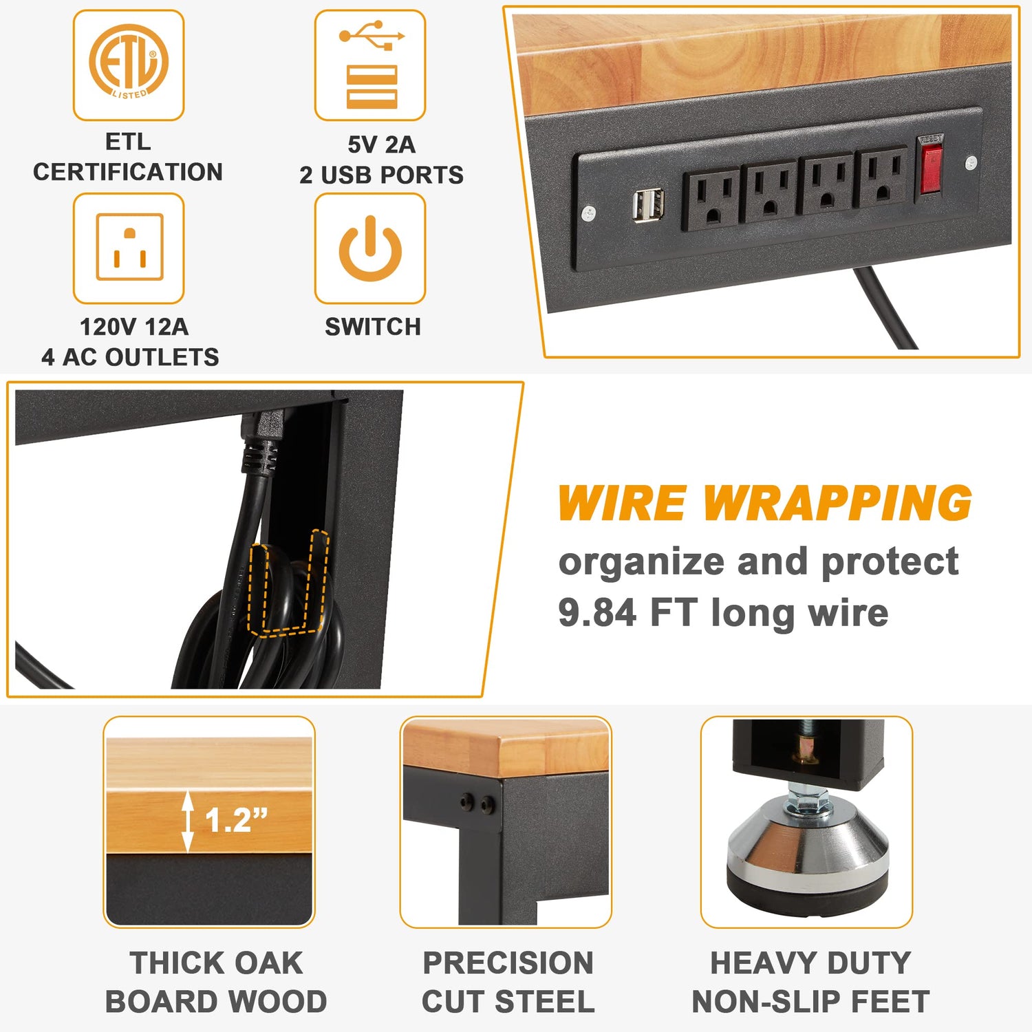 - 【ETL CERTIFICATION POWER OUTLETS】Equipped with power outlets, it is extremely convenient to use various of electric tools and lamps. Totally 4 AC Outlets, 2 USB Ports and 1 Switch on the power strip which is ETL certified for safety and durability.