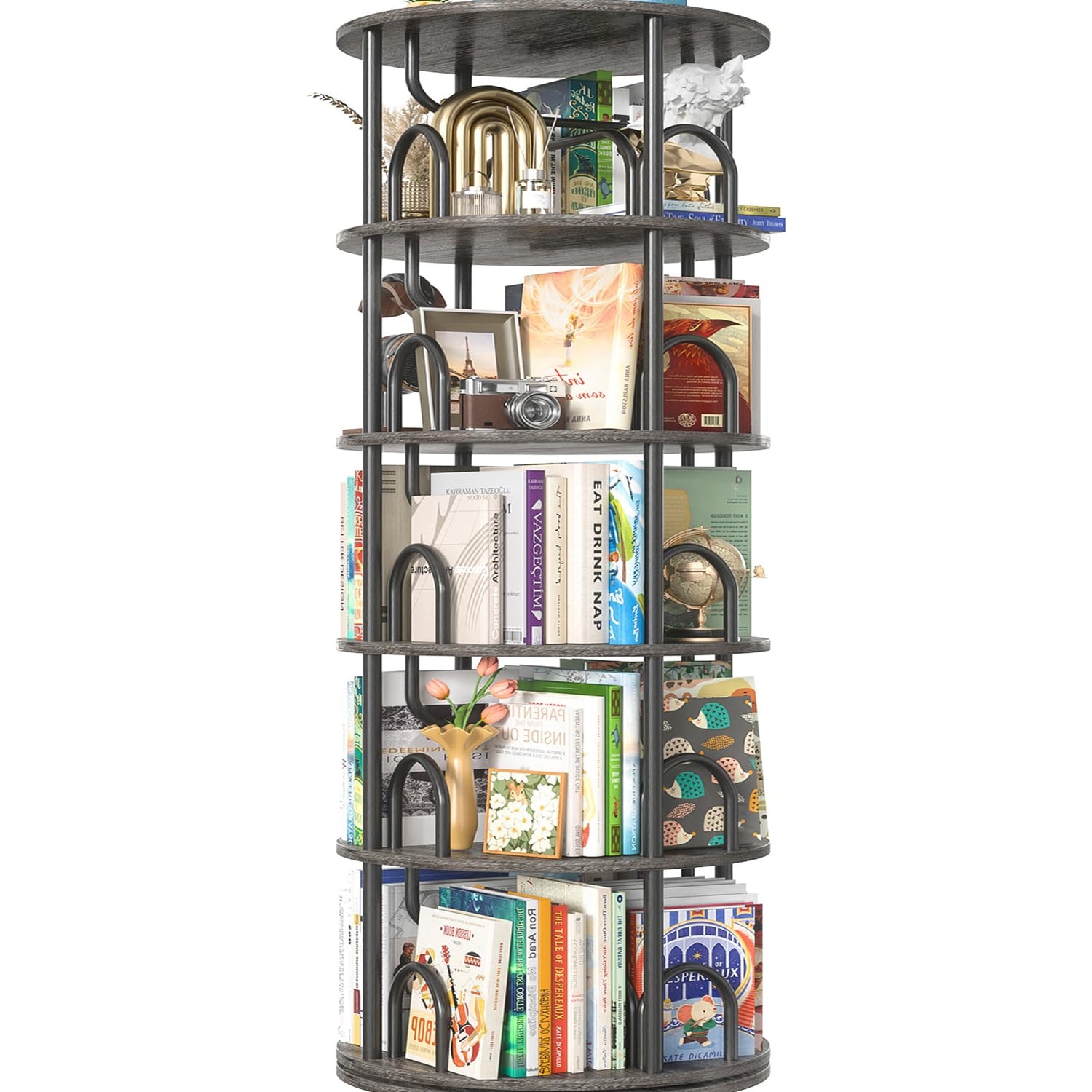 Aheaplus 5 Tier Rotating Bookshelf Tower, 360 Display Spinning Bookcase, Revolving Round Book Shelf Narrow Swivel Bookshelf, Vertical Turning Corner Book Organizer for Small Space, Black Oak