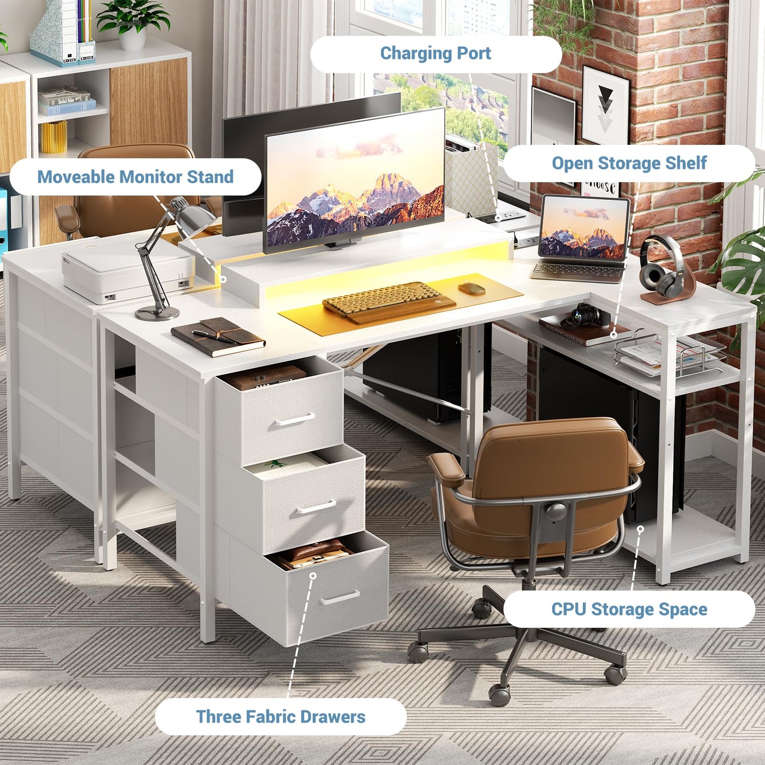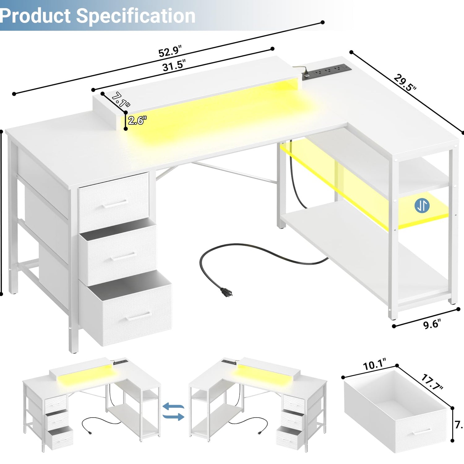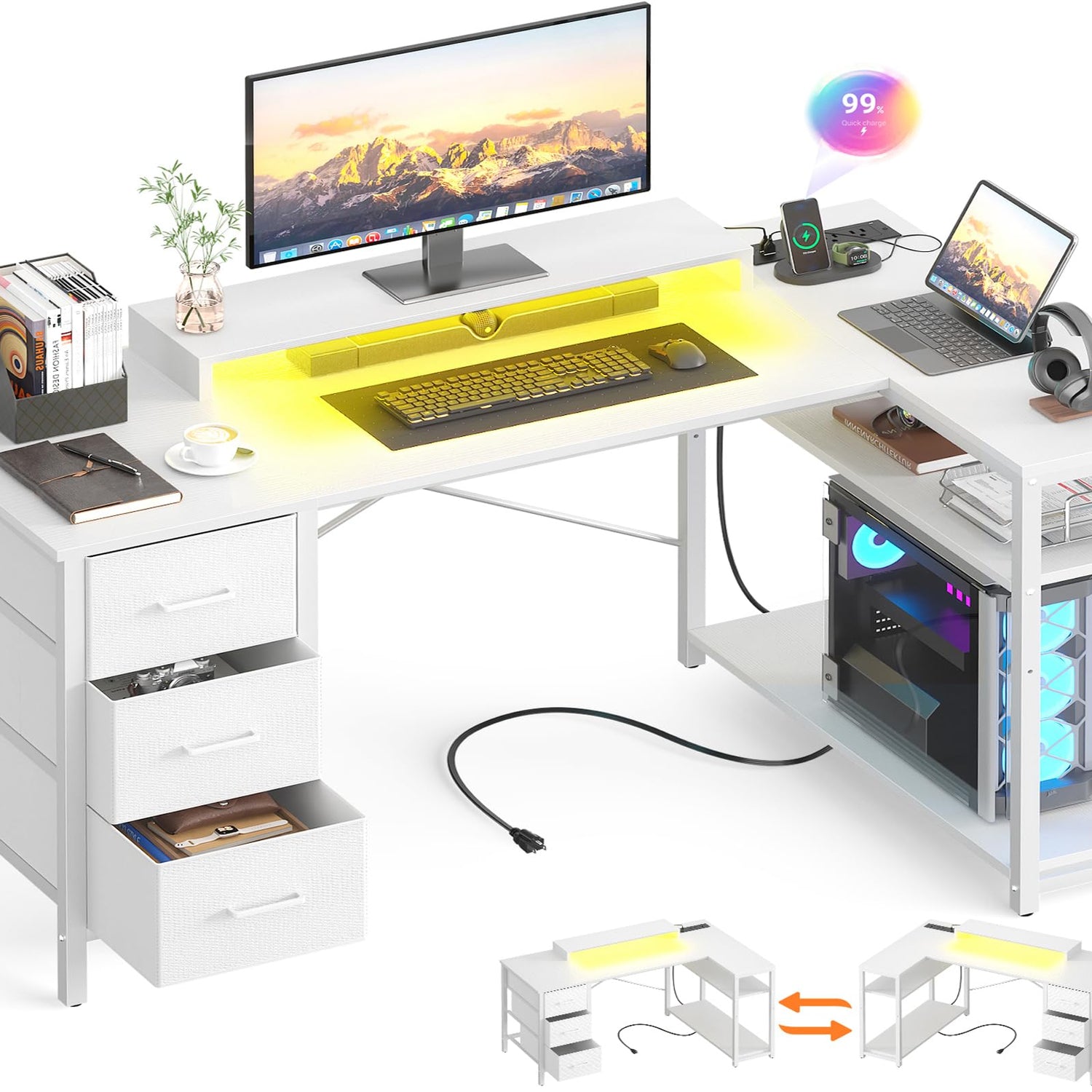 Aheaplus 53 Inch Gaming Desk with Power Outlets & LED Lights, Reversible L Shaped Computer Desk with 3 Drawers & Monitor Stand, Home Office Desk Corner Gamer Desk with Storage Shelves, White