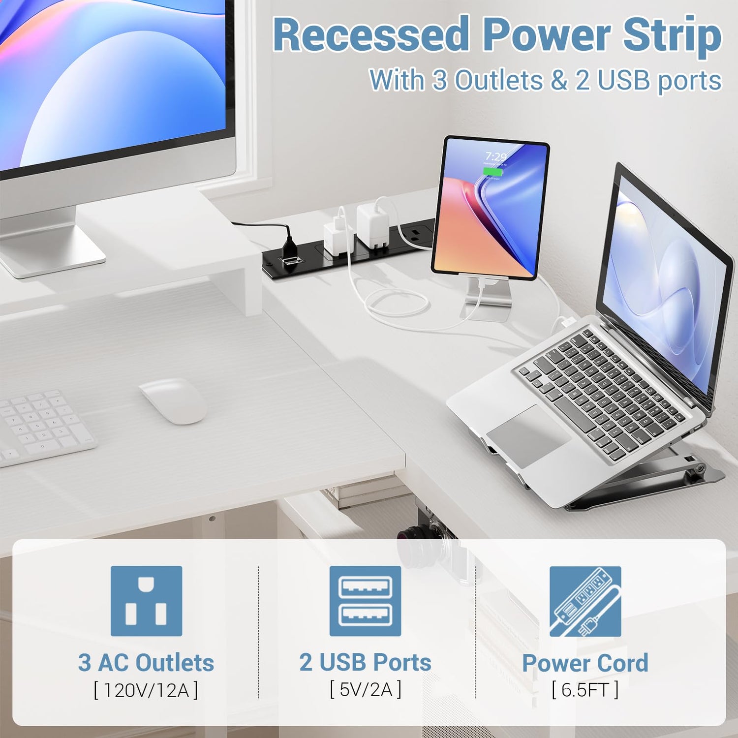 - 【L Shape Desk With Power Outlet】Our l shaped office desk with power outlet features 3 AC outlets + 2 USB charging ports to provide power for up to 5 devices simultaneously. Easily providing convenient charging for your laptop, phone, ps4 and gaming devices. This desk streamlines device charging, ensuring both convenience and safety. without messing up your space with additional extension cords.