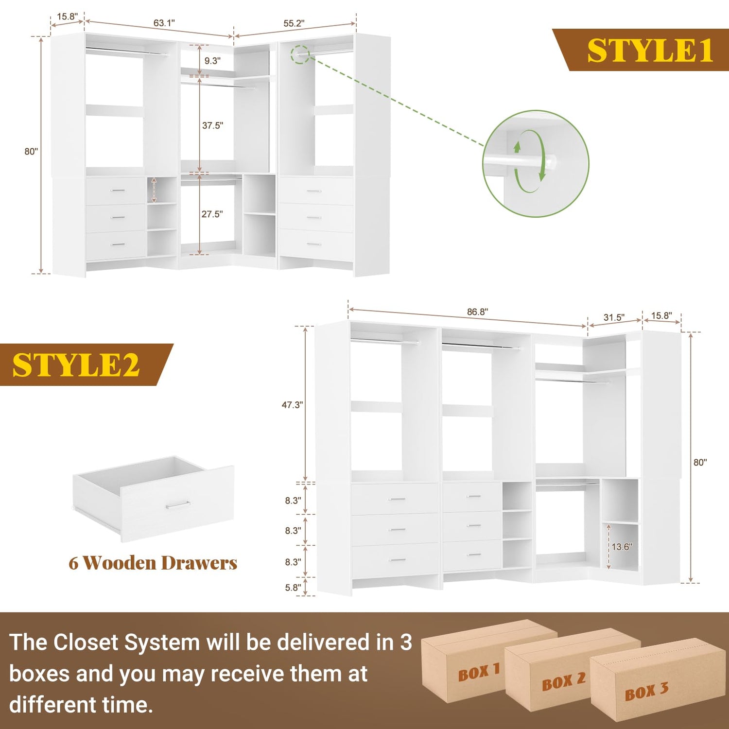 Aheaplus Closet System with 3 Sets, 86.8" Closet Organizer System with 6 Drawers & 4 Hanging Rods, L Shaped Walk-in Closets, Wardrobe Set, Corner Tower, Garment Rack Load 2000+LBS, -X1,White