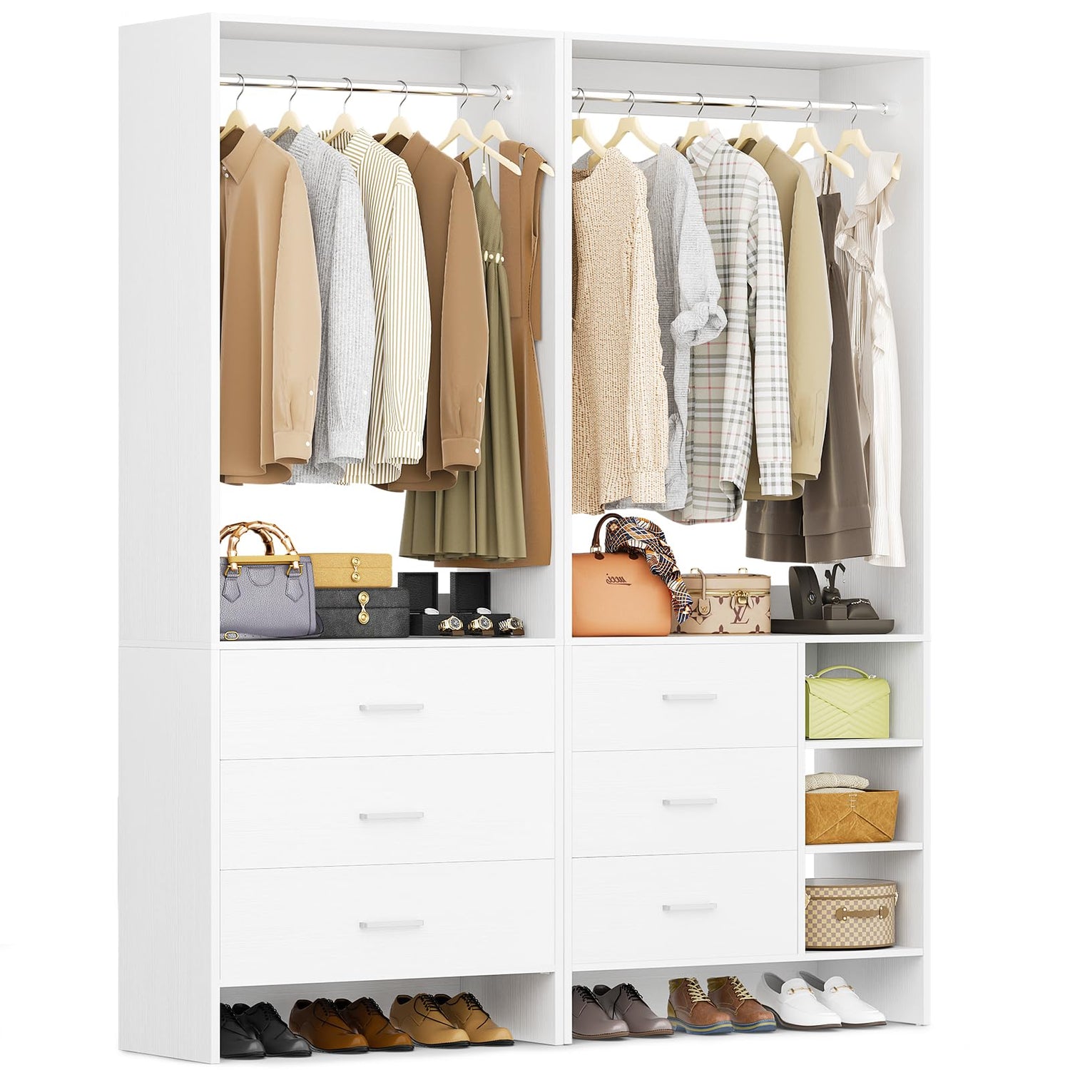 Aheaplus Closet System with 6 Drawers, 4.5ft Wood Closet Organizer System, Walk-in Closet or Small Closets Wardrobe, Clothes Rack with Hanging Rods, Set of 2, White