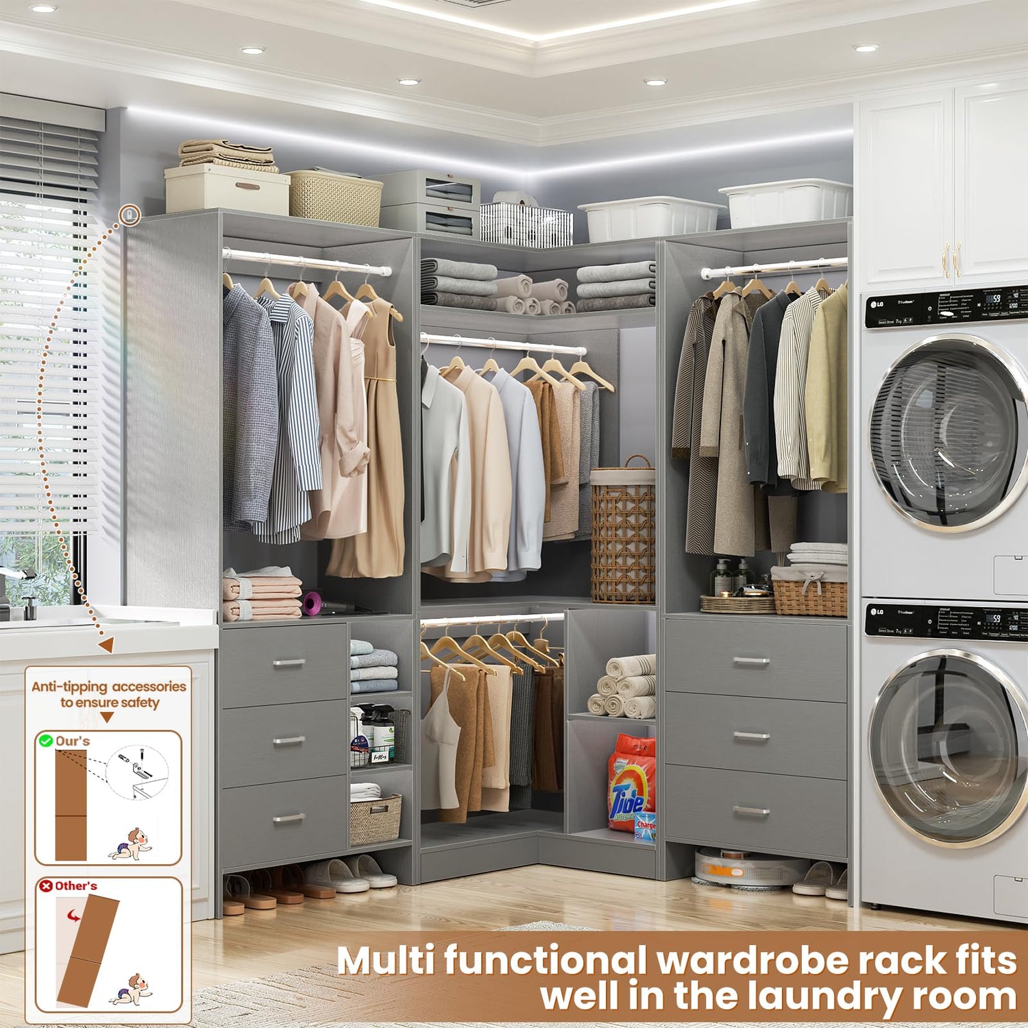 Aheaplus Closet System with 6 Drawers, 4 Hanging Rods & Corner Tower, Corner Closet System with Hanging, 86.8" L-Shaped Walk-In Wardrobe Organizer, 2000+ lbs Capacity, Set of 3, Grey