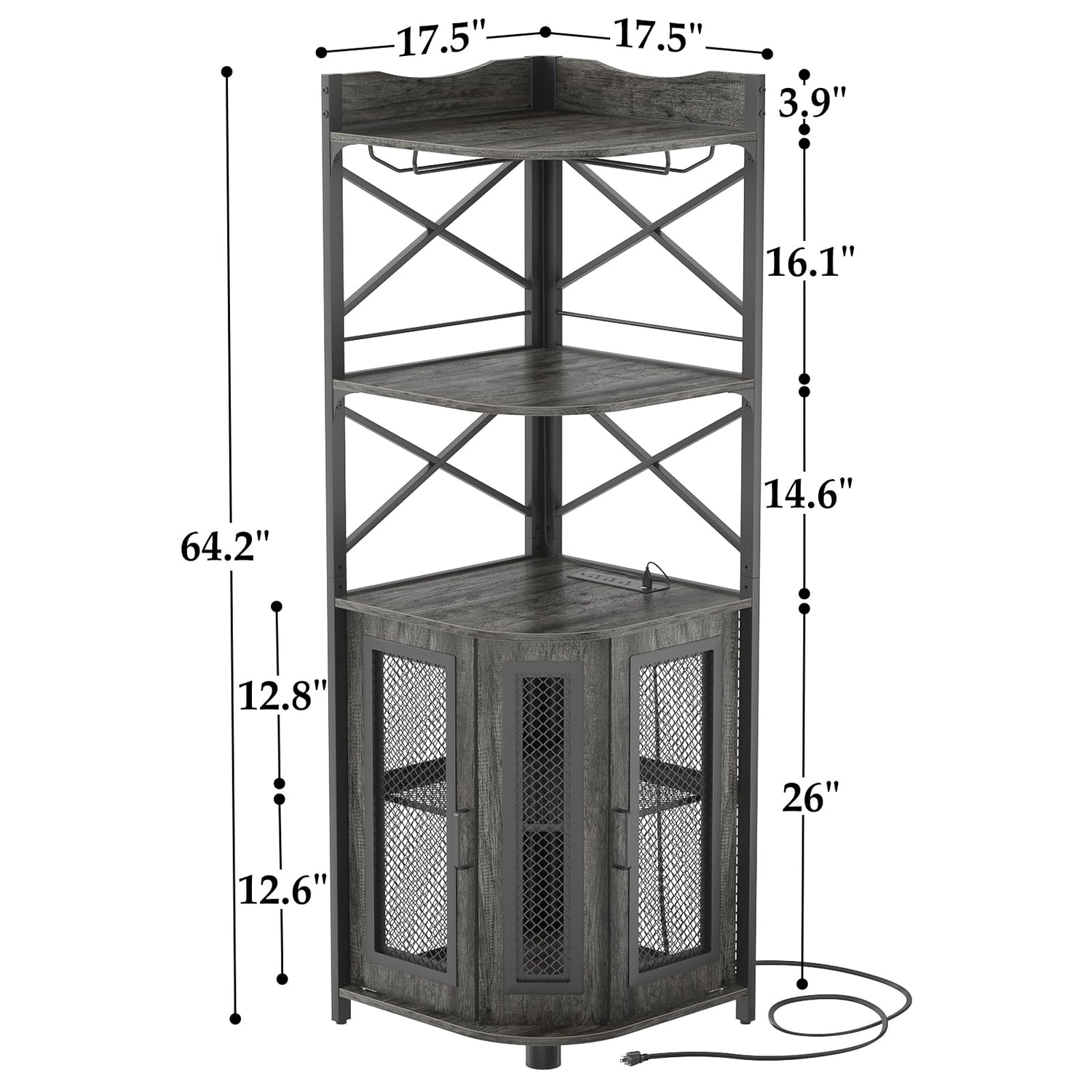 - 【Corner Wine Cabinet with Charging Station】Our bar cabinet is equipped with 3 Outlets& 2 USB ports, which help you easily charge your coffee maker, juicers, bar accessories, glowing lights decorations even your phone and other electrical appliances. don't need to find additional power strips, All-in-one Design adds more convenience to your life. The length of the cable is 6.56FT long.