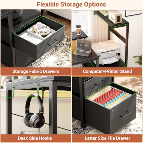 - 【Powerful Storage Function】This home office desk with storage offers ample storage solutions, including 1 fabric drawers,1 File Drawer, 1-tier high storage shelves, a printer cabinet, two side hook. Make you can easily keep printer or scanner within easy reach of your desk. The monitor stand protects your neck and spine health and also creates extra storage space for your items. meet all your needs with this all-in-one office desk.