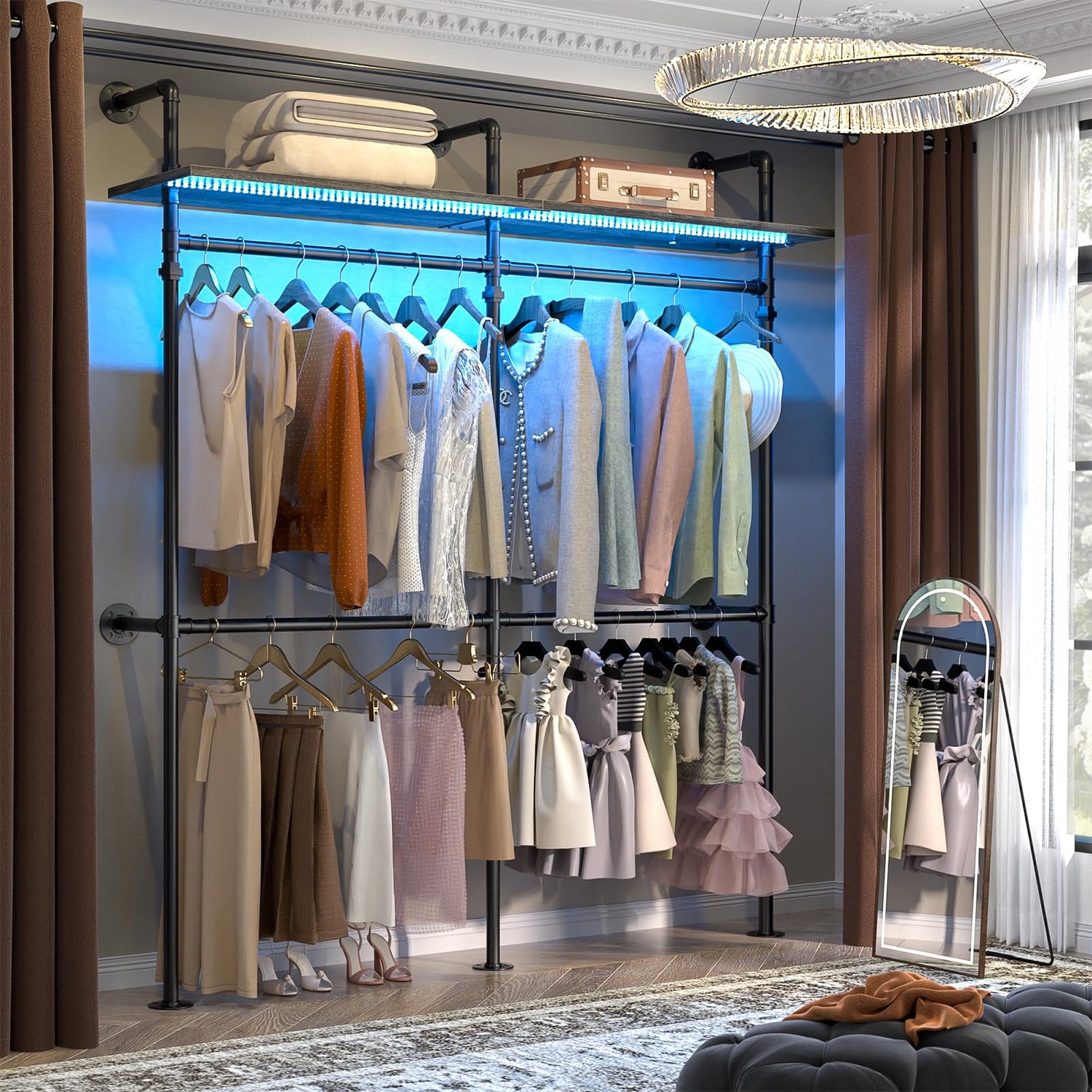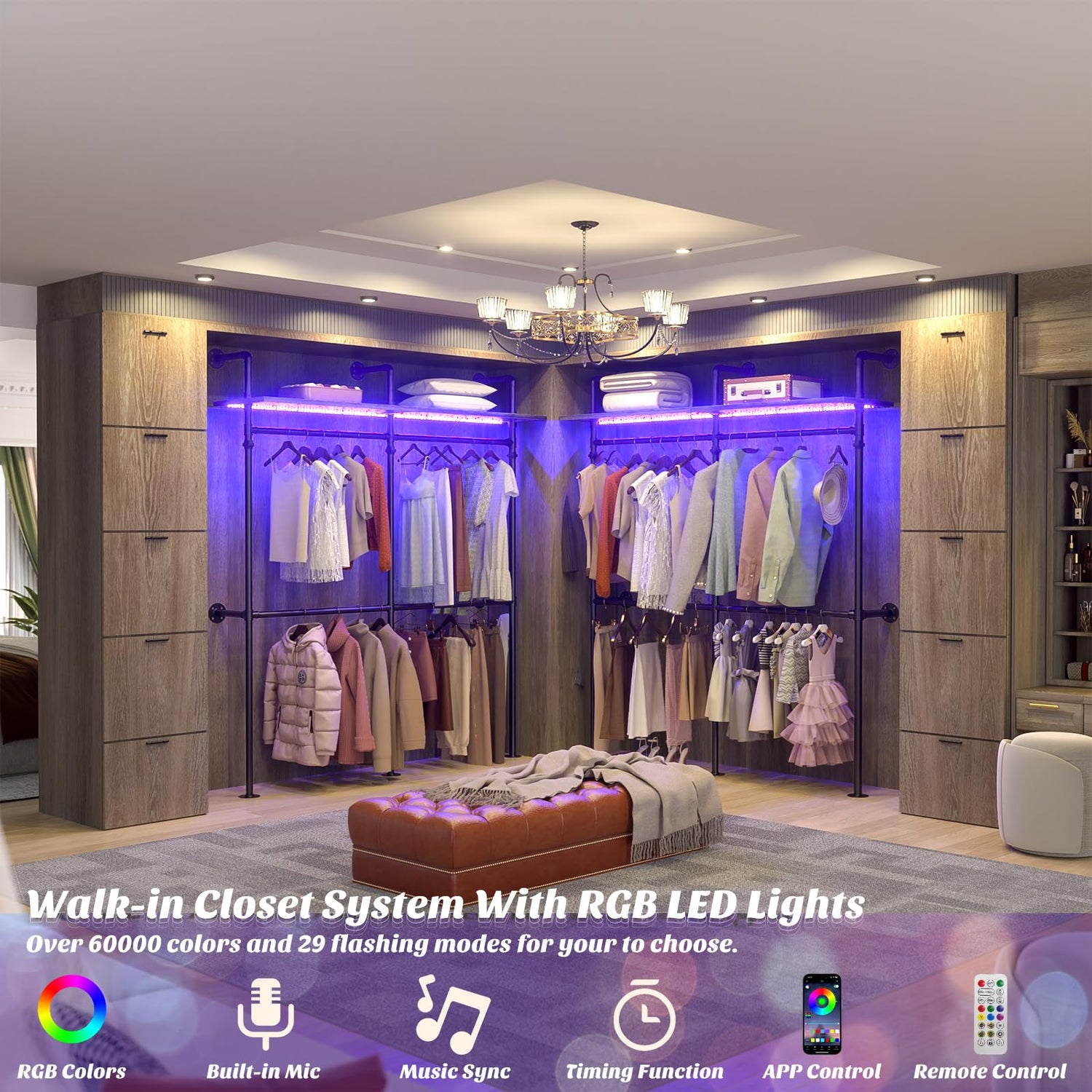 - 【 Clothes Rack with Cool LED Lights】This industrial Pipe Clothing rack comes with RGB LED light for colorful, and over 20 colors and multiple flashing modes for your to choose. It has a memory function that keeps the led lights in the last mode when turned on. Easily match the atmosphere you create for your home Walk-in Wardrobe space.