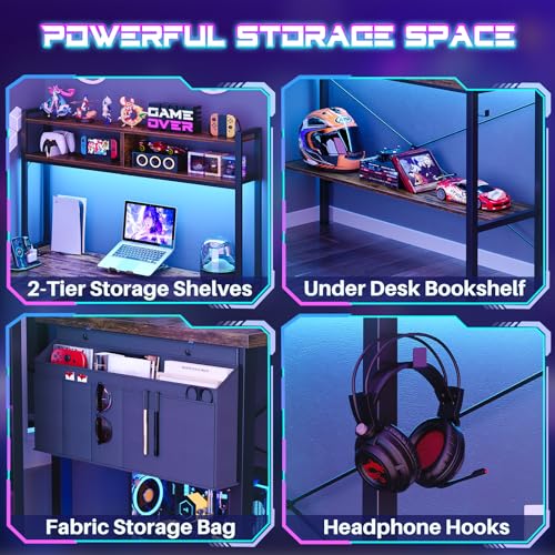 - 【Reversible L Shaped Desk】This 59'' L shaped gaming desk comes with power outlet, light strip, storage shelves, headphone hook and storage bag for home office or gaming. The reversible design and the top hutch can be fixed on the left or right side according to your needs, perfect fit perfectly in the corner while providing maximum space. A great choice for home office, game, and living room.
