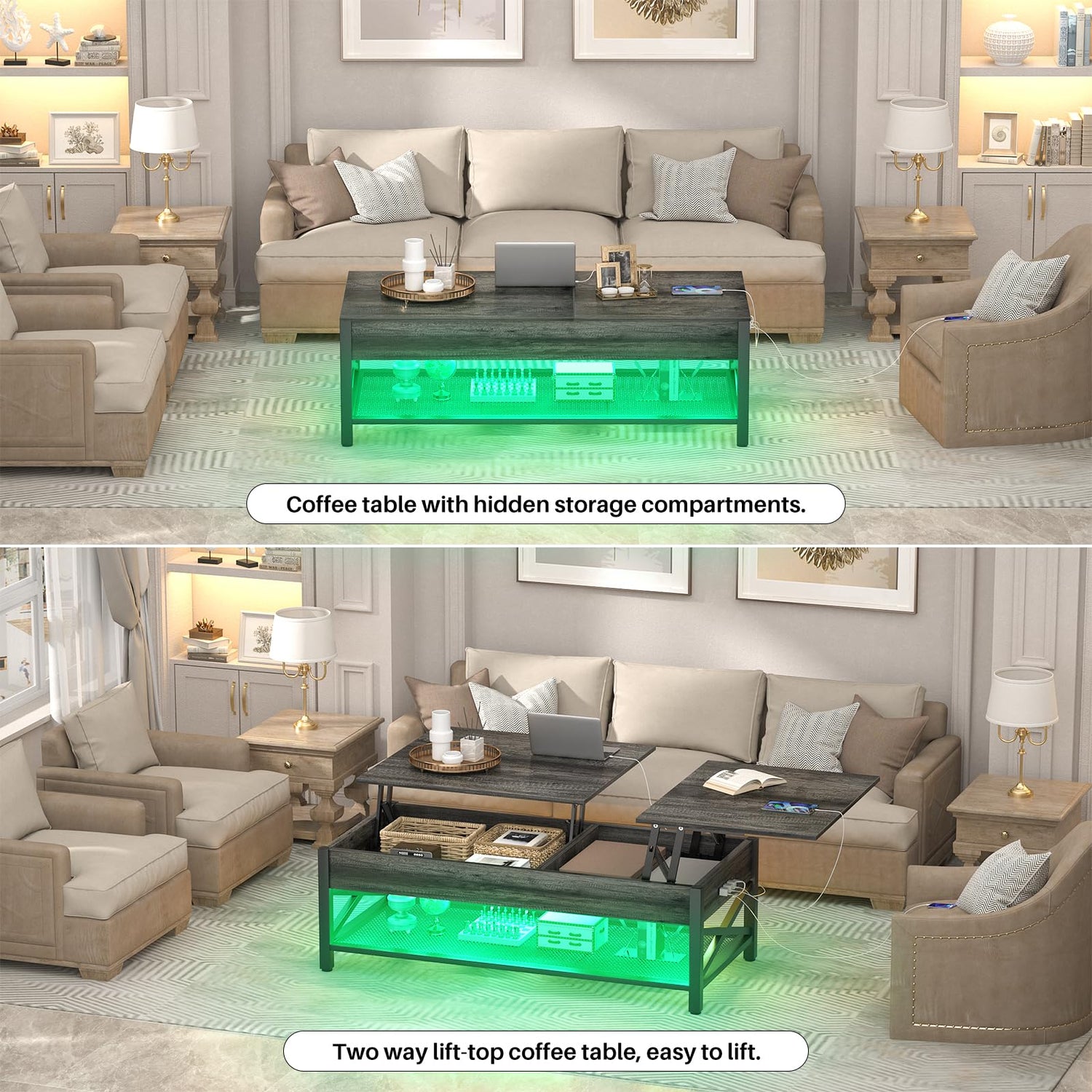- 【Spacious Storage Space】The lifted surface keeps the essential items within easy reach while creating an extra storage space beneath. 2 hidden storage areas that provide you with the perfect spot to stow away any essentials you wouldn't want your guests to see. Additional open shelf provides the perfect place for you to display exquisite decorations. Expand your available storage space for your living room.