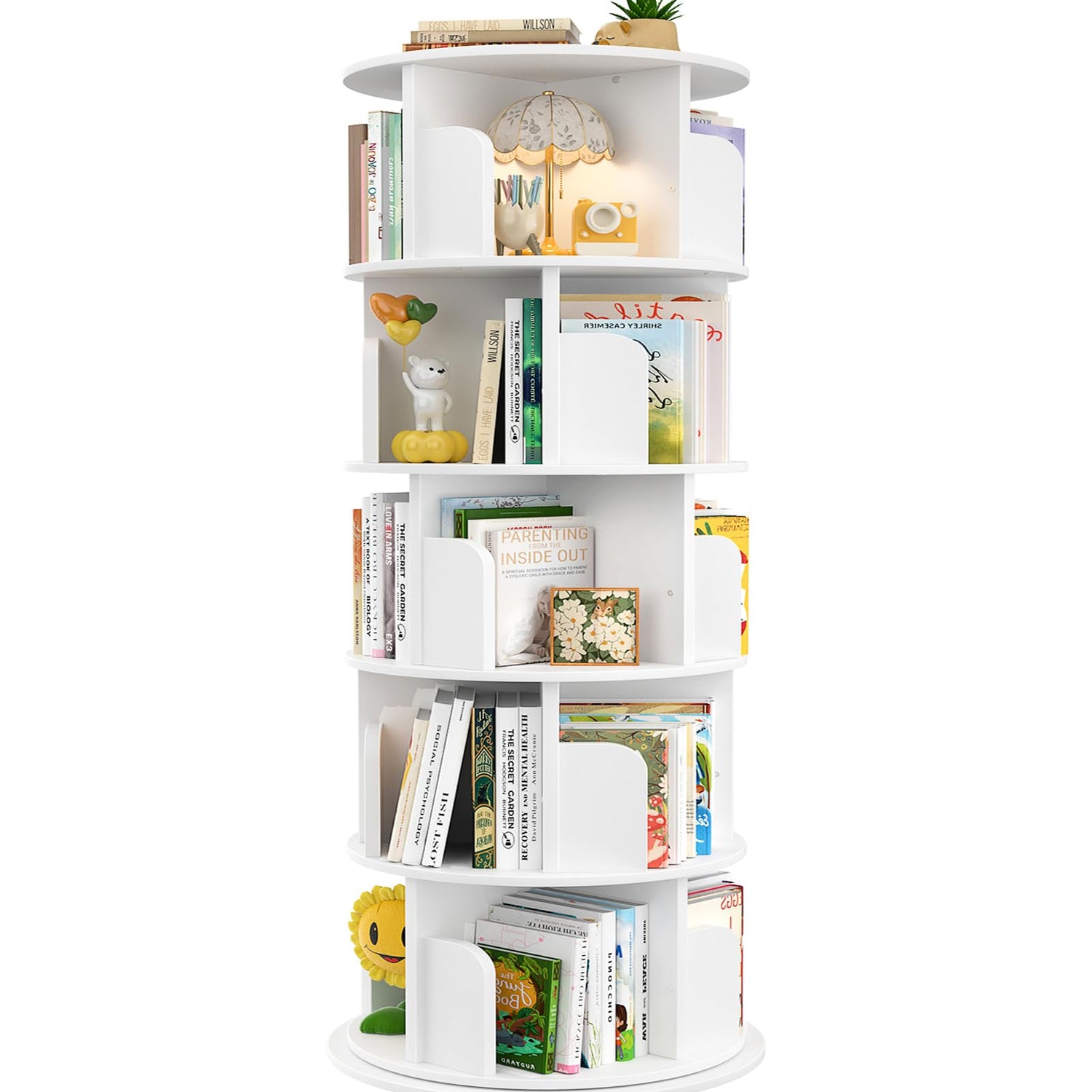 Aheaplus 360° Rotating 5-Tier White Bookshelf Tower