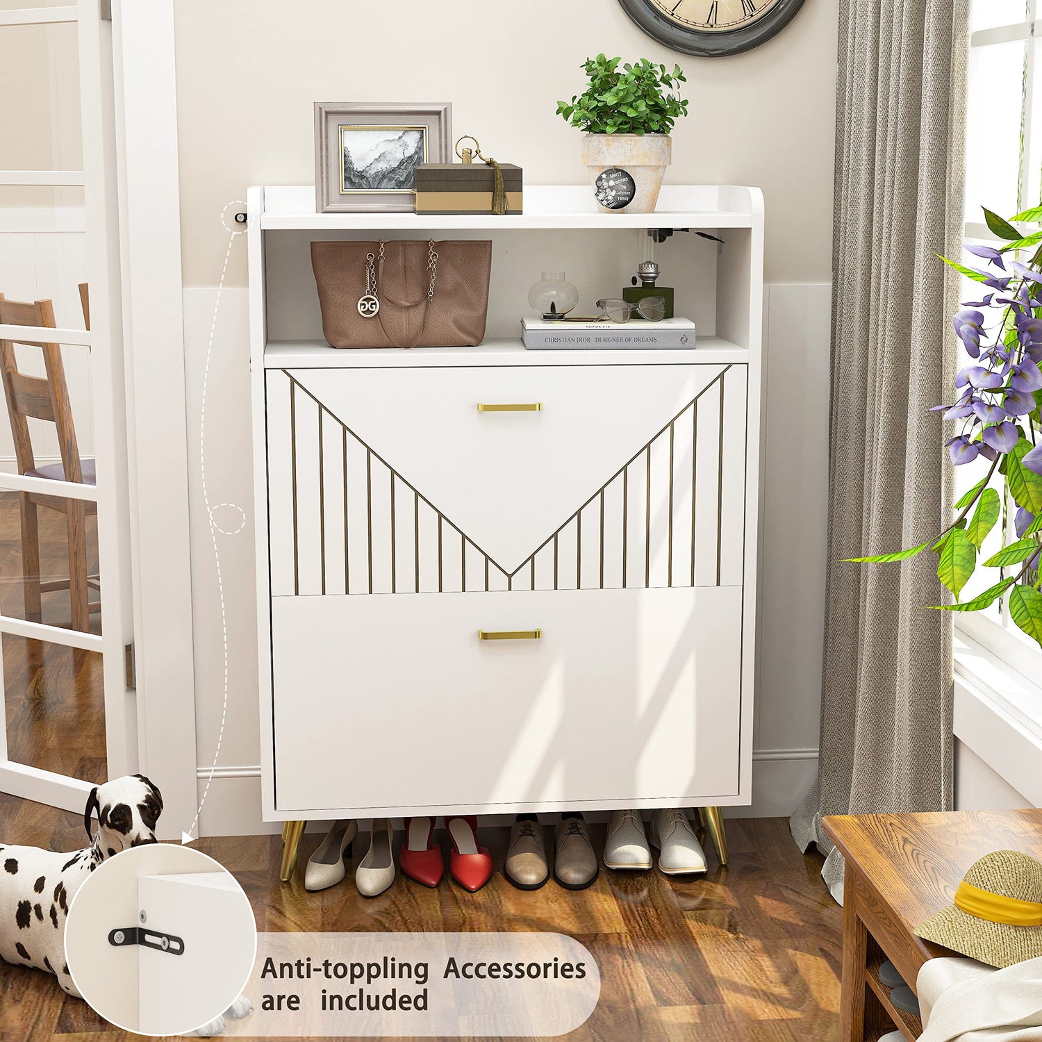 Aheaplus Shoe Cabinet with Flip Doors, Shoes Storage Organizer with Motion Sensor Led Light, Entryway Wood Freestanding Tipping Bucket Shoe Rack with Open Shelves for Closet, Living Room, White