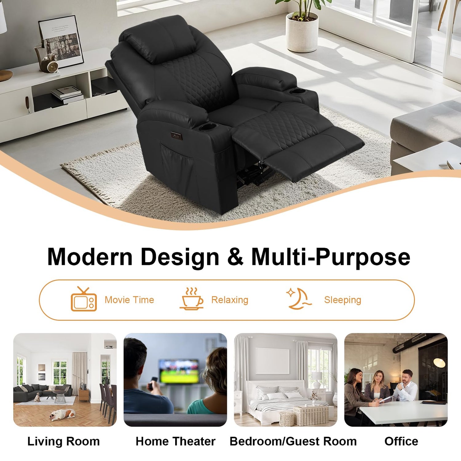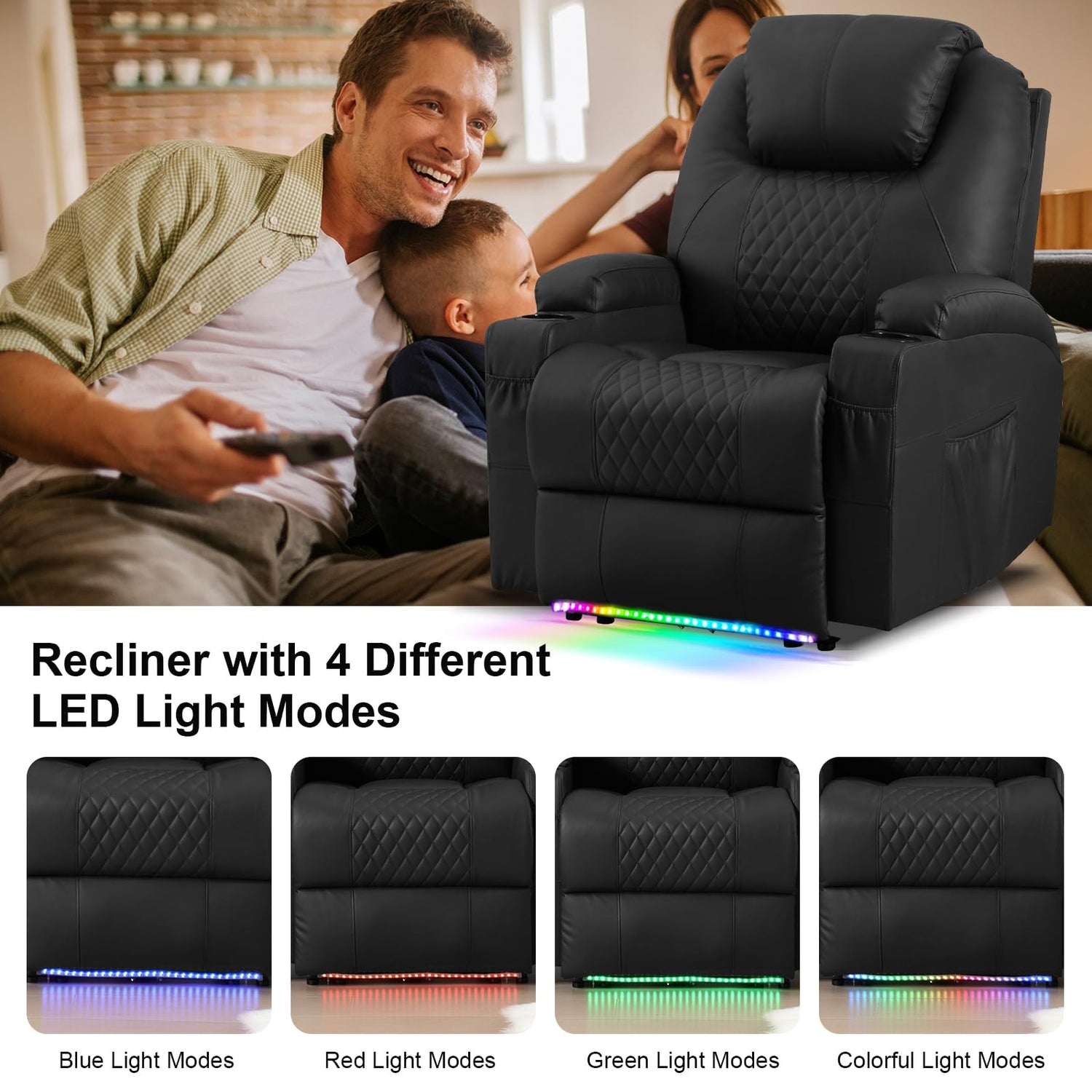 AHMED Power Recliner Chair with Vibration Massage & Heat for Adults, Faux Leather Home Theater Seating with Cup Holders/LED Lights/USB Ports/Side Pockets for Living Room, Black