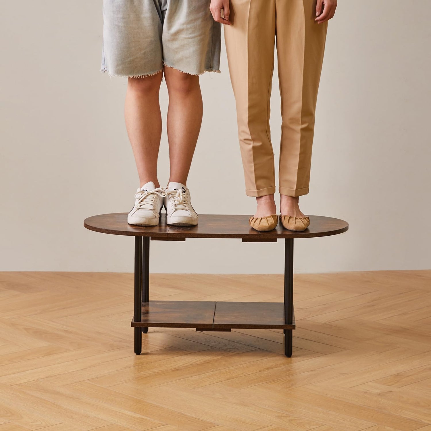 - Oval Coffee Table: This table for living room features natural solid wood legs and a rustic tabletop, ensuring stability and durability. The rounded edges provide added safety, making it perfect for families with children. It is both stylish and safe