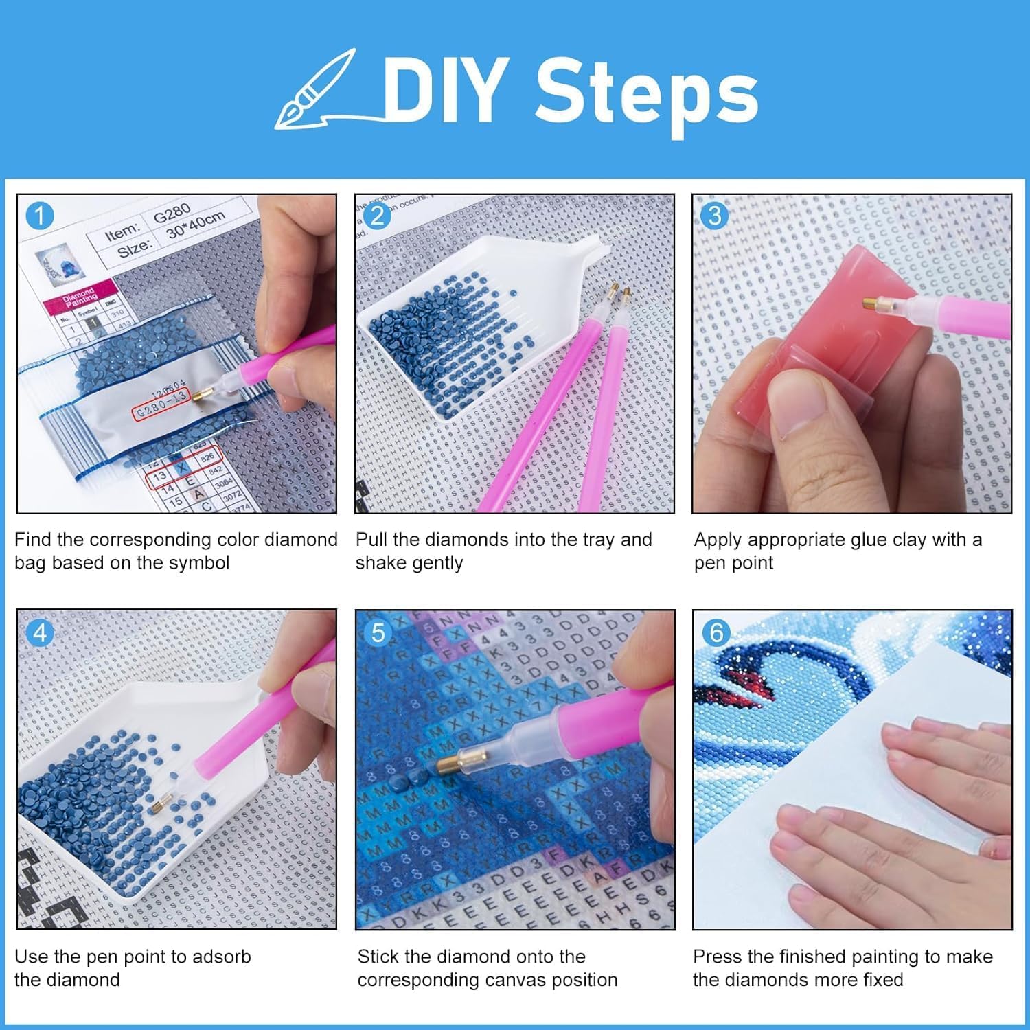 - Provide The Needed Diamond Painting Tools:Provide a HD easy-to-read canvas,enough diamonds,spot diamond pen,wax blocks,diamond trays,storage bags;If you are a beginner,just have this one diamond painting kit is enough